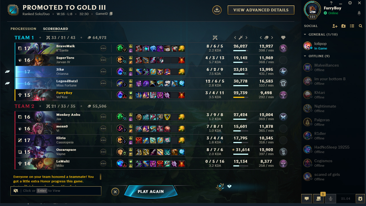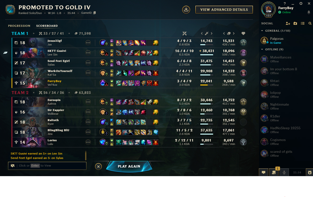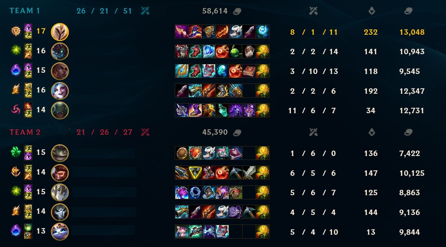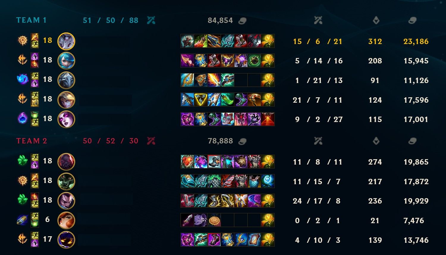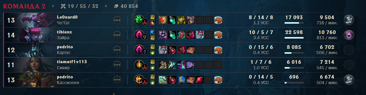 Камбечная произошла. Хуила на Викторе имел чёткий план на деранк или бан аккаунта, потому смело райткликал под вражескую башню и Ясуо с первой минуты, имея 0-10-0 на 10-й минуте. Хуила на Гвен, видимо, анальный дружок, выгораживал его и газлайтил, что "просто анлаки гейм". Еще и сурры, пидоры, отклоняли. Пришлось назло им выкладываться на 110% против расфиженного Ясуо и пермасплитпуссящего сиона с 6-тью грабсами и роумящего ВВ и убирать все говно, что наворотили эти 2 гения с топа и мида. Если б не Эзреаль с Морганой, тильтанувших МФку и потом также потеющих, вьебали бы. На 35-й минуте у врагов все 11 таверок были на месте.
