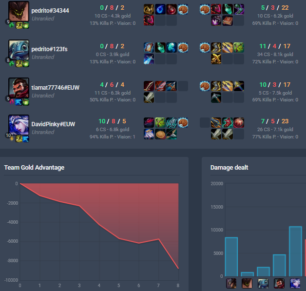 >>49597061 ну не скажи. вот, например, команду ебали в 4 смычка. счет был чёт около 4-13, лес проёбан, мид просто не существует, типа 0-7-1, обезьяна шароёбится по всей карте и делает дабл киллы одной левой. из 4 киллов 2-3 мои. всё. начались прожатия ФФ.
