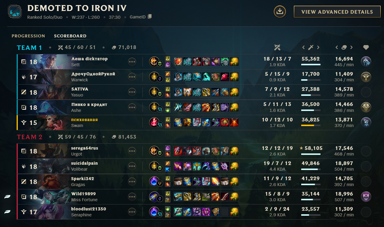 разушь такая пьянка и перды становяца лолерами опишу и свой экшпириенс. в доке у меня 3800ммра было хз в каком году когда еще лесники кароче были, любил на легионке прыгать с армлетом в сапиков нажираться на них домагом и потом разъебывать остальных по ситуации, ну и стоял в лесу чтоб на лейне не стоять не денаить ластхитить вотэтовот всё. в лоле как самого простого героя выбрал мисфортуну, отыграл до 30го уровня нормально в свифтплее даже на който хуй в эмеральд лобби меня кидало, но нормально линии стоялись спокойно, конечно более посасывал чем нет, но играбельно. а как настал момент запустить ранкед то сразу попался против какихто бешено спамящих зонящих срущих в тебя за полтора экрана скилами задров в первой же игре сука, причем сразу закинуло на кой то хуй в голд лобби меня блядь, нового игрока сразу к задротам нахуй посмотреть справится ли. естественно 0 10 нахуй и невозможность приблизится к крипам 24/7 просто изза того что в тебя спамят хуйней. а потом мне стало похуй и я попробовал собрать на лулу сюрикен на сброс кд скила 15% после атаки чтобы как у меня в голове это представлялось "захексить челика на 4 секунды на изи" естественно из 4х проигрышей этого ни разу не удалось сделать но и похуй. порадовало хотяб то что Никс как и я в итоге БРОНЗА ЕБАНАЯ АХАХАХ
