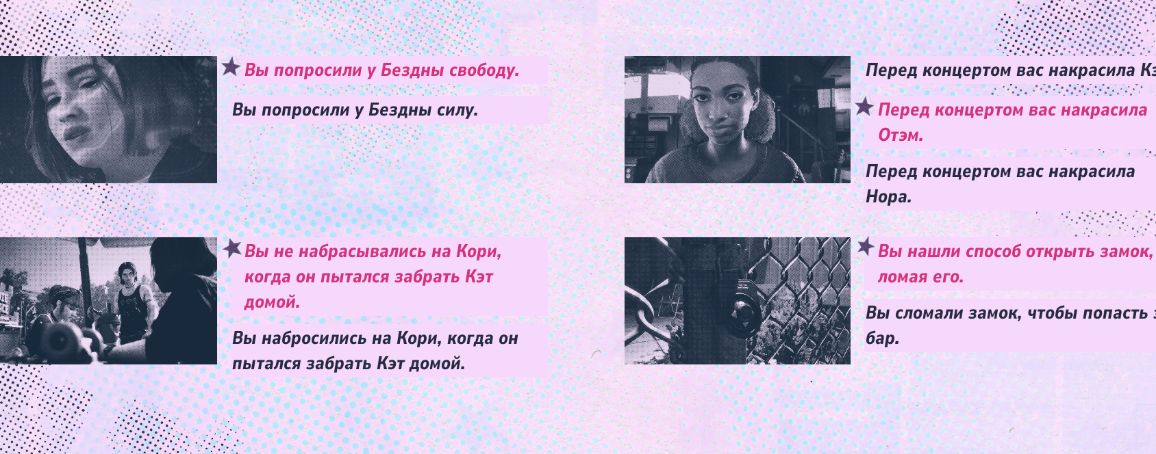 >>49770568 В начале выбор концовки из LiS 1 и, если Хлоя выжила, то она есть в игре, но есть нюанс она начала параноить, что Макс мотает время в тайне от нее, они посрались и расстались. В игре есть только письмо от нее и можно чекать посты в местой соц сети, а ну и еще она с Викторией тусит