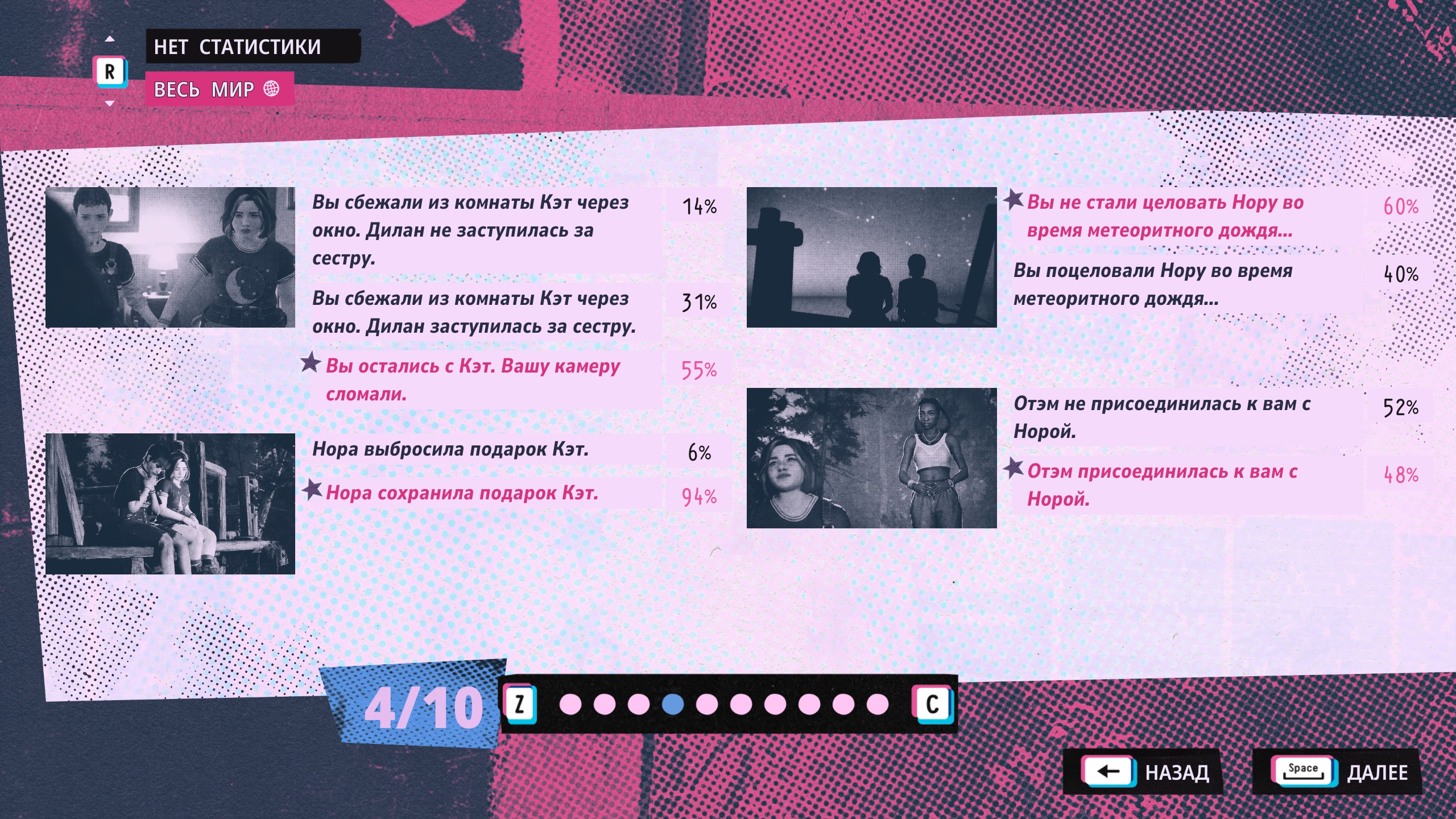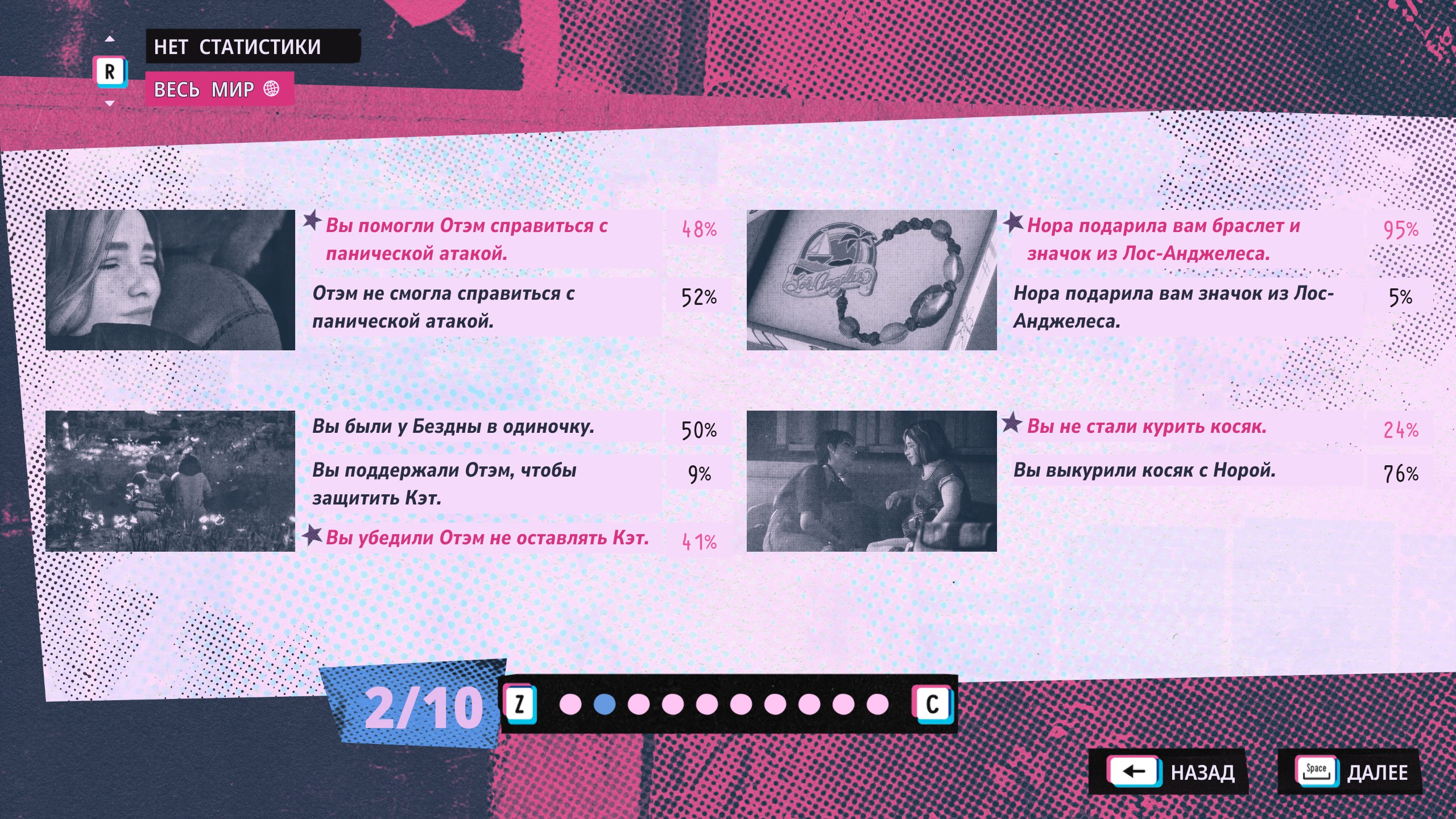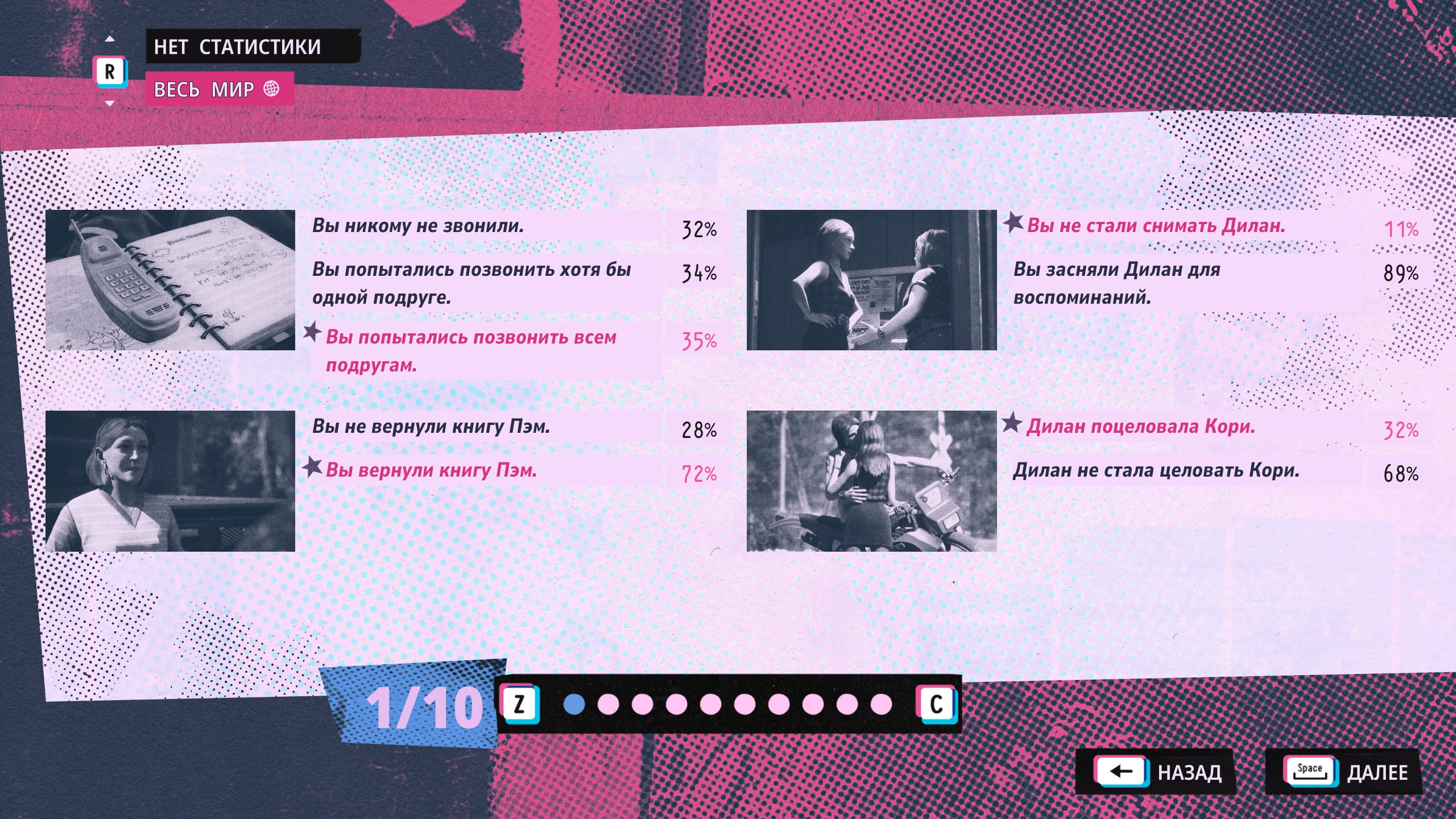Ну такое короче. Типа норм. Типа душевно. Но у меня кажись самая обоссанная история и концовка вышла - все девочки мне просто подружки, никого не заромансил, в конце все разбежались. Типа недодружил или чё, я не понял. Ну и вопросов только больше оставили, нихуя не объяснили. Хотя подтвердились многие предположения и теории. Наброс то ли на продолжение, то ли длц, то ли ещё что. Первая плёнка 10 из 10. Вторая чёт прям ооочень средняя. Мб имеет смысл переиграть с другими выборами. В целом я удовлетворён, хотя ждал большего. Си ю ин хэл йопта.