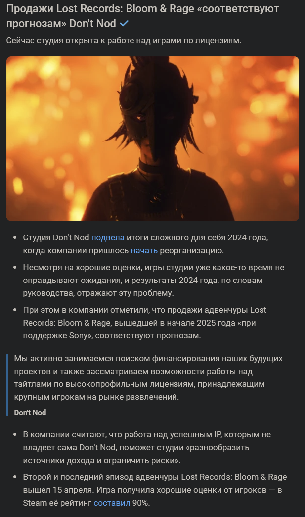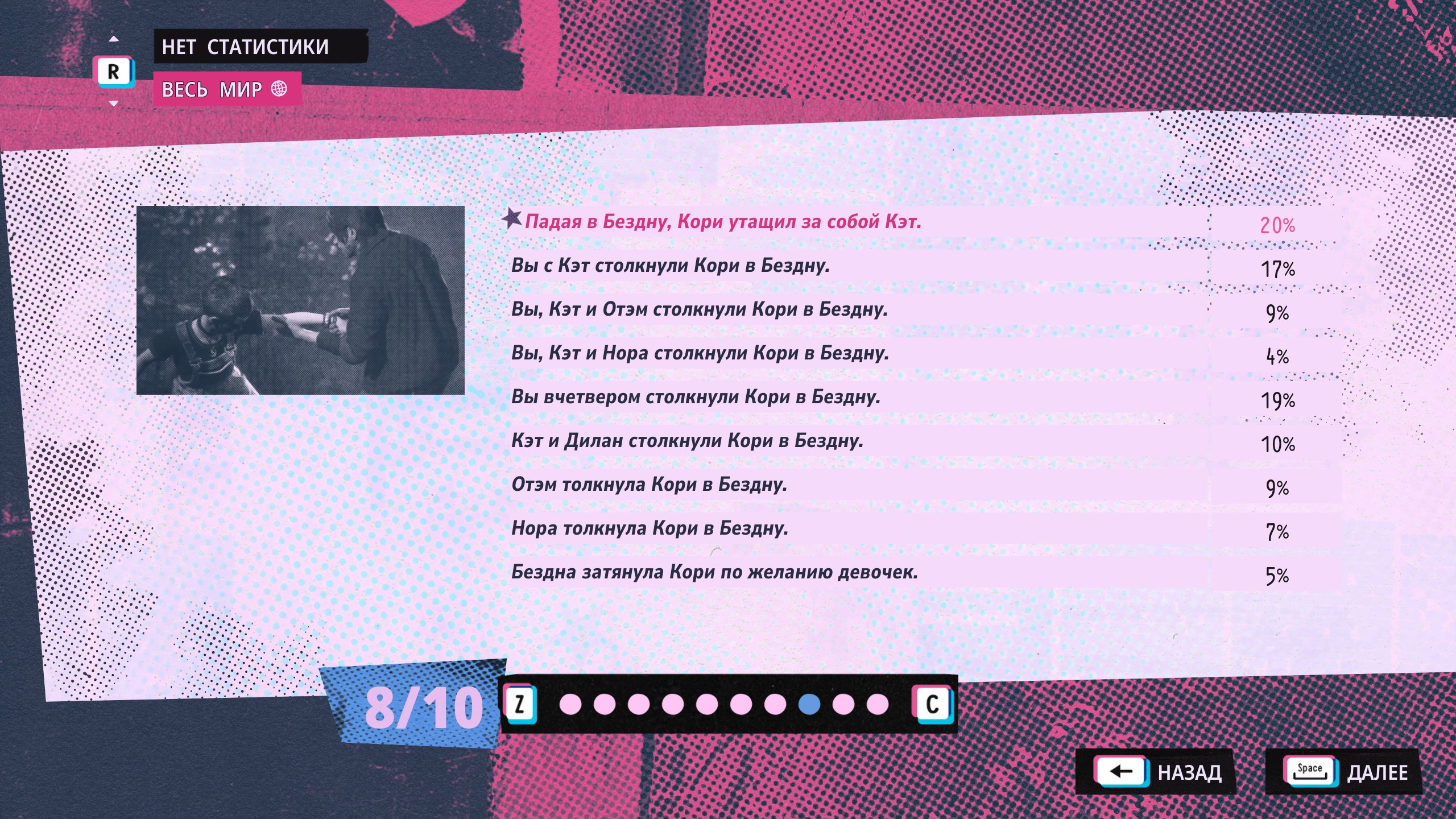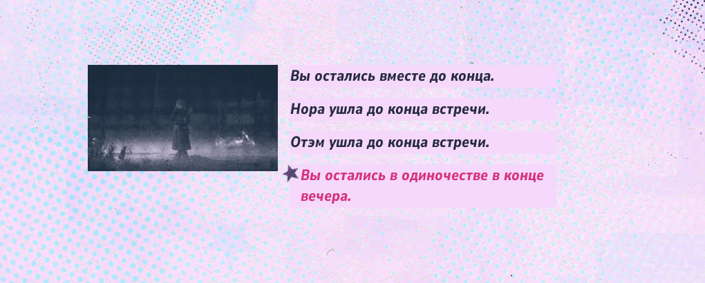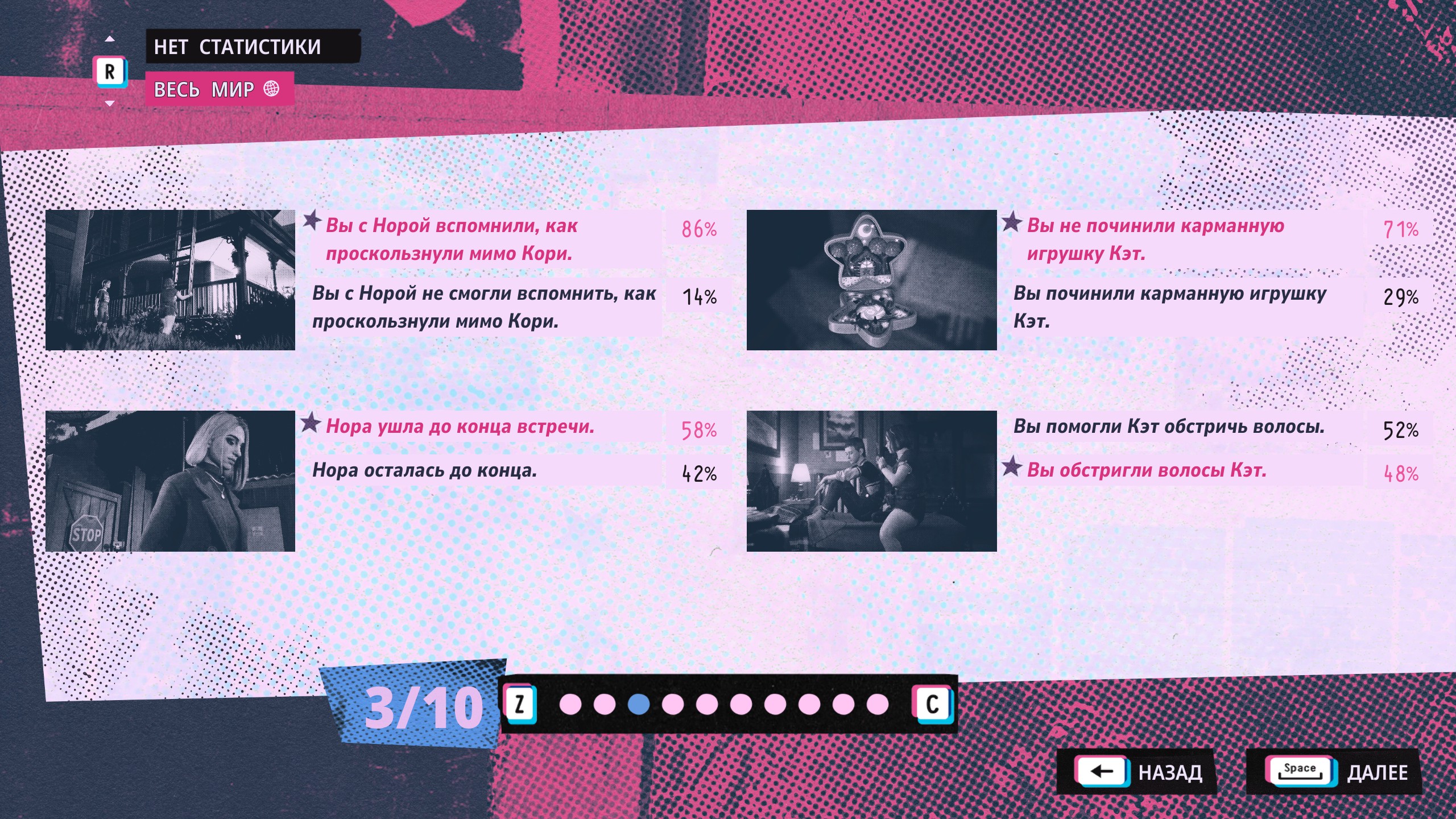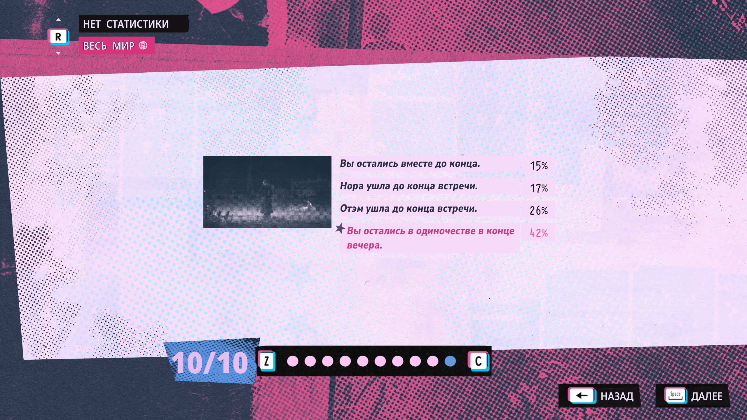 Ну такое короче. Типа норм. Типа душевно. Но у меня кажись самая обоссанная история и концовка вышла - все девочки мне просто подружки, никого не заромансил, в конце все разбежались. Типа недодружил или чё, я не понял. Ну и вопросов только больше оставили, нихуя не объяснили. Хотя подтвердились многие предположения и теории. Наброс то ли на продолжение, то ли длц, то ли ещё что. Первая плёнка 10 из 10. Вторая чёт прям ооочень средняя. Мб имеет смысл переиграть с другими выборами. В целом я удовлетворён, хотя ждал большего. Си ю ин хэл йопта.