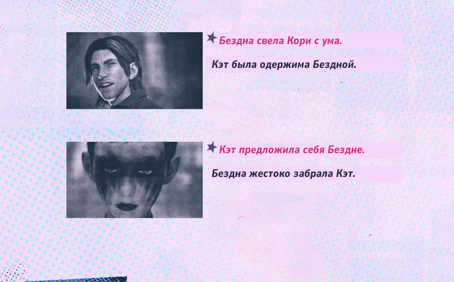 Челик, 20+ лет блять булит школьниц, и те просят помощи у паранормальной силы чтобы он отстал от них. НУ ПИЗДЕЦ ИНТЕРЕСНО ХАХАХАХА Вместо фиолетовой бездны исполняющей желания могли бы сделать что-то интереснее. Полно всяких отсылок в игре, и ничего дельного не позаимствовано. У меня в конце обе дурочки слились и убежали. Чего они там бояться? Я понимаю почему в "Оно" после того как уже взрослые ГГ узнали о возвращении колуна некоторые хотели слиться и даже кое-что посерьезнее, но тут что такого? Анон выше написал о "симуляторе пинания хуев". Вот он прям прав. Ничего с героинями не происходит серьезного. Кори в роли главного злодея это какой-то прикол наверное. Бездна в итоге унылая дыра. Одна Кэт и её рак тащат сюжет. Короче, Dont Nod сами виноваты. У них была возможность сделать интерактивное кино-хоррор с элементами "Оно", "Твин Пикс", "Очень странные дела" и т.д. а сделали это. Разумеется продажи низкие.