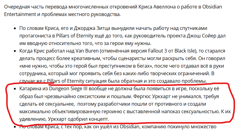 Взяли дурилку, ответственную за худшую часть первых столбов (текст) на роль геймдизайнера. Пусть наслаждаются успешным успехом Вот бы знать, кто за каких персонажей ответственен. Почему-то уверен, что самых неприятных, типа главной атеистки, писали именно бабы. Недавно и по патфайндеру эта теория подтвердилась, одна жируха ответственна за всех, кто мне не нравится правда там вообще почти всех спутников бабы писали