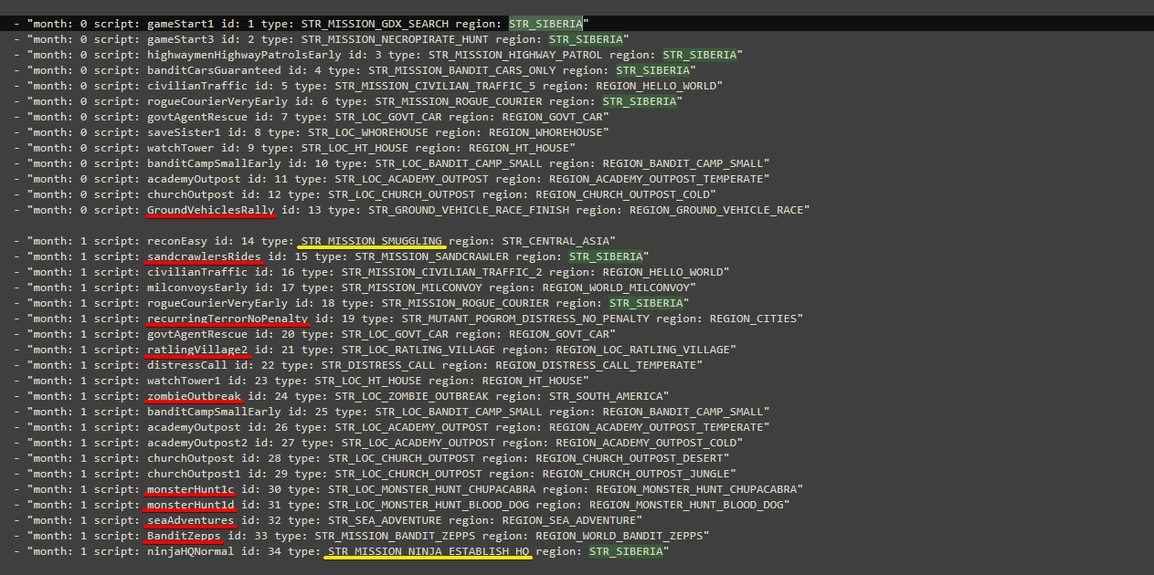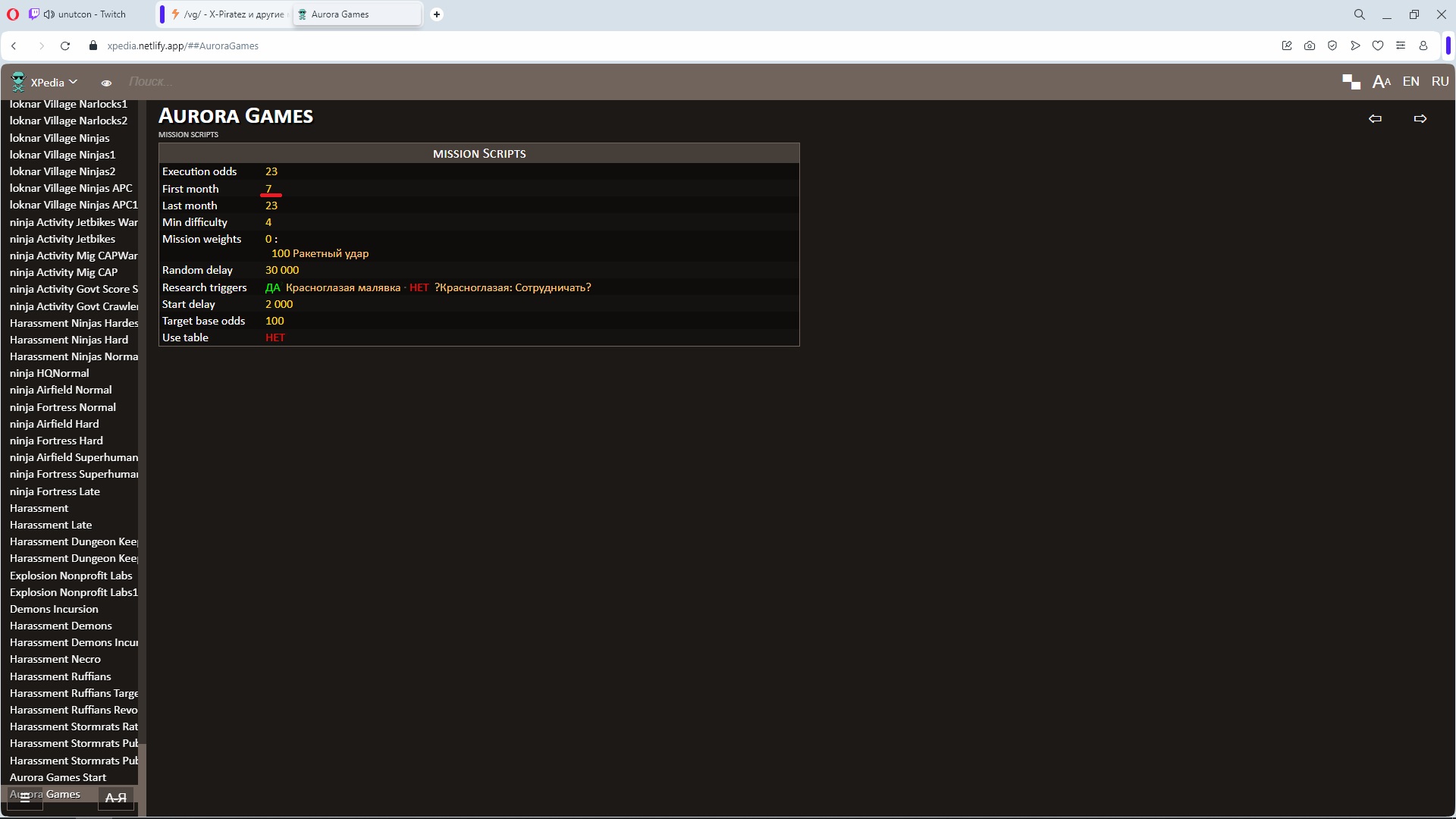 Я вот единственное решил попробовать прочитать работу скриптов. Вот я смотрю, что есть 4 скрипта Red Lily Game, у всех них Start Delay 10000 и Random Delay 30000, у Red Lily Game Starter стоит last month 3 и вероятность 100, у остальных вероятность 30, нет последнего месяца, но есть технологические условия прекращения нападений. Правильно ли я понимаю, что это означает, что каждые 10000-40000 минут (что соответствует примерно 7-28 дням) с шансом 30% спаунится правительственный корабль с миссией атаковать убежище за каждый активный скрипт?