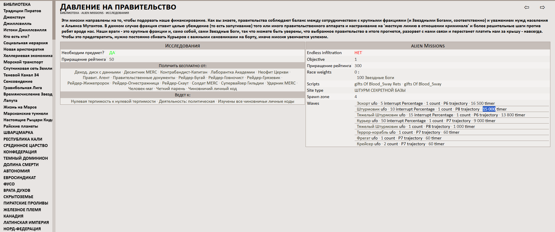 >>50236460 Все корабли летают с миссией. Миссия состоит из цепочки пролётов корабликов. Давление на правительство, например имеет целую кучу. Сначала Эскорт, через 15 000 минут Штурмовик и так далее. В конце сразу прилетают пару крейсеров и штурмовиков и ставят базу. Interrupt Percentage шанс сломать всю цепочку.