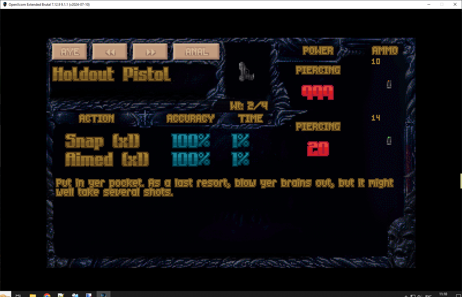 >>49674094 (OP) >оружейного порно Ахаха калоксин все оружие превратил в пукалки. Что бы оно рояло мне пришлось накатить боксе, написать скрипт для генерации мода который бустит целкость на 30% минимум ну там линейная интерполяция хуе мое и второй для огнестрела который менят ролл куба урона с 0-200 на 2 куба с 0-100. Ну и опции в боксе что бы даже промахи близко к цели летели. Короче убрал половину рандома. Огнестрел наконец опасен вне зависимости в чьих цепких клешнях он оказался, укрытия решают. Стал в чистом поле - в тебя даже криворукий уебан попадет. Перекатывайся @ укрывайся, тогда норм. Ну и раз взялся васянить - поднял урон по террейну у безоружной атаки в джва раза. Типа пинок, двери вышибать и заборчики ломать. Единственное что бесит - пульки в очередях вылетают по одной за раз. Даже на максимальных настройках летят долго.