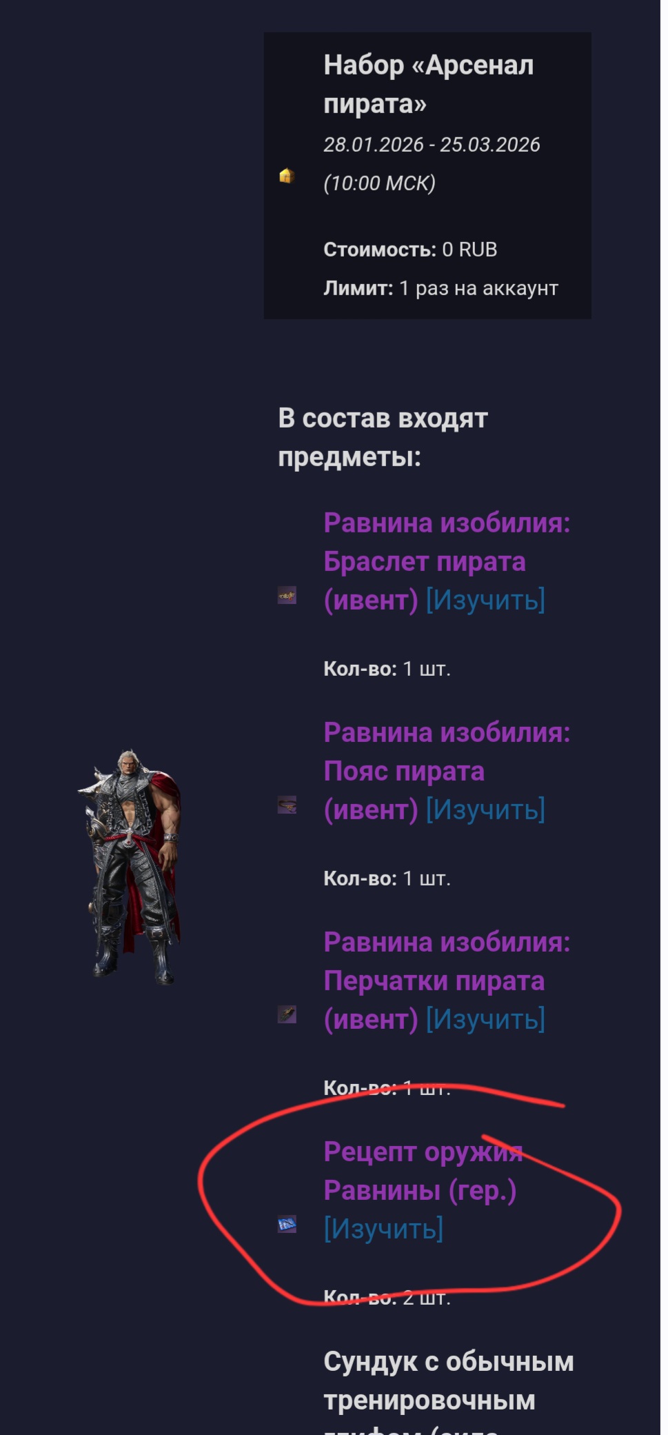 в лаунчере нажми магазин там есть бесплатные наборы арсенал пирата арсенал злодейки( возможно уже нету его) берешь все что бесплатное кароч и забираешь в игре