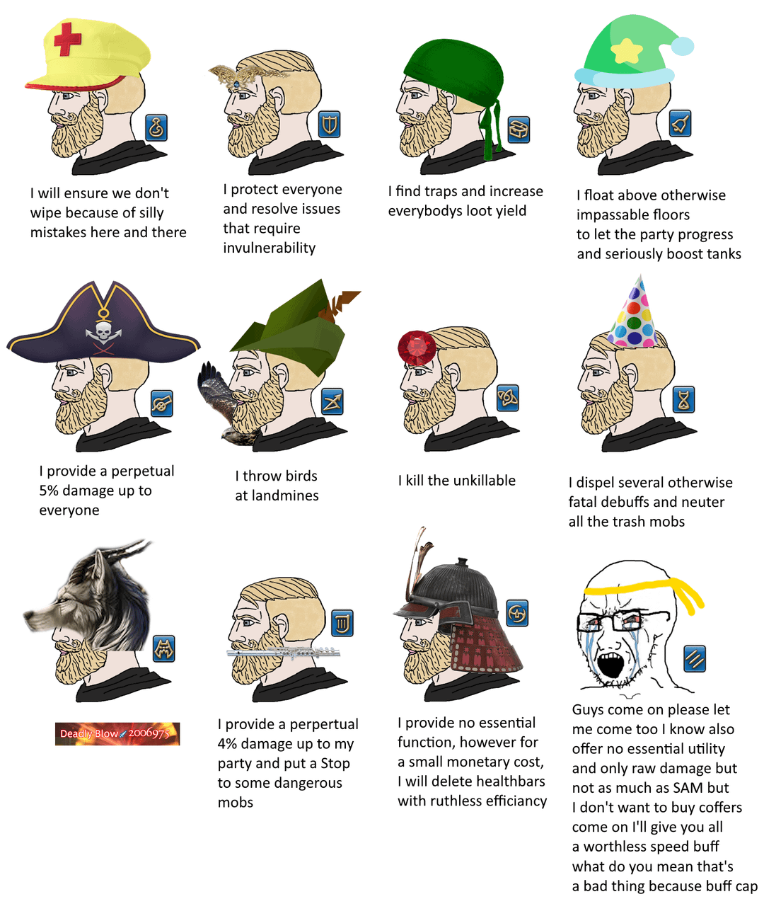 >>50105915 Сам подход к боевке унылое дерьмо. Все джобы представляют из себя примерно одно и то же. Есть какой-то центральный гиммик, в виде гауджа, к нему прикручивается 1-2-3 комбо, даётся 2 огкд 30сек КД, 1 огкд 1мин кдлибо 1мин кд на 2 заряда 30 сек огкд, 2 мин пати бафф либо соло бафф. Вот и вся фекалка. Играть в это тупо скучно. Зато разработчикам очень просто, минимум переменных для баланса. Но даже при таком раскладе они срут себе в штаны. В плане класс дизайна вовно никто не может переплюнуть, потому что ещё на запуске ванилы разработчики заложили такой охуенный фундамент, на который очень просто настраивать нововведения. А у фекалки фундамент изначально был уебищным. Да и сама фекалка всегда была уебищная, и все вы говноеды. Сдохла параша, 3 месяца треду, ору нахуй.