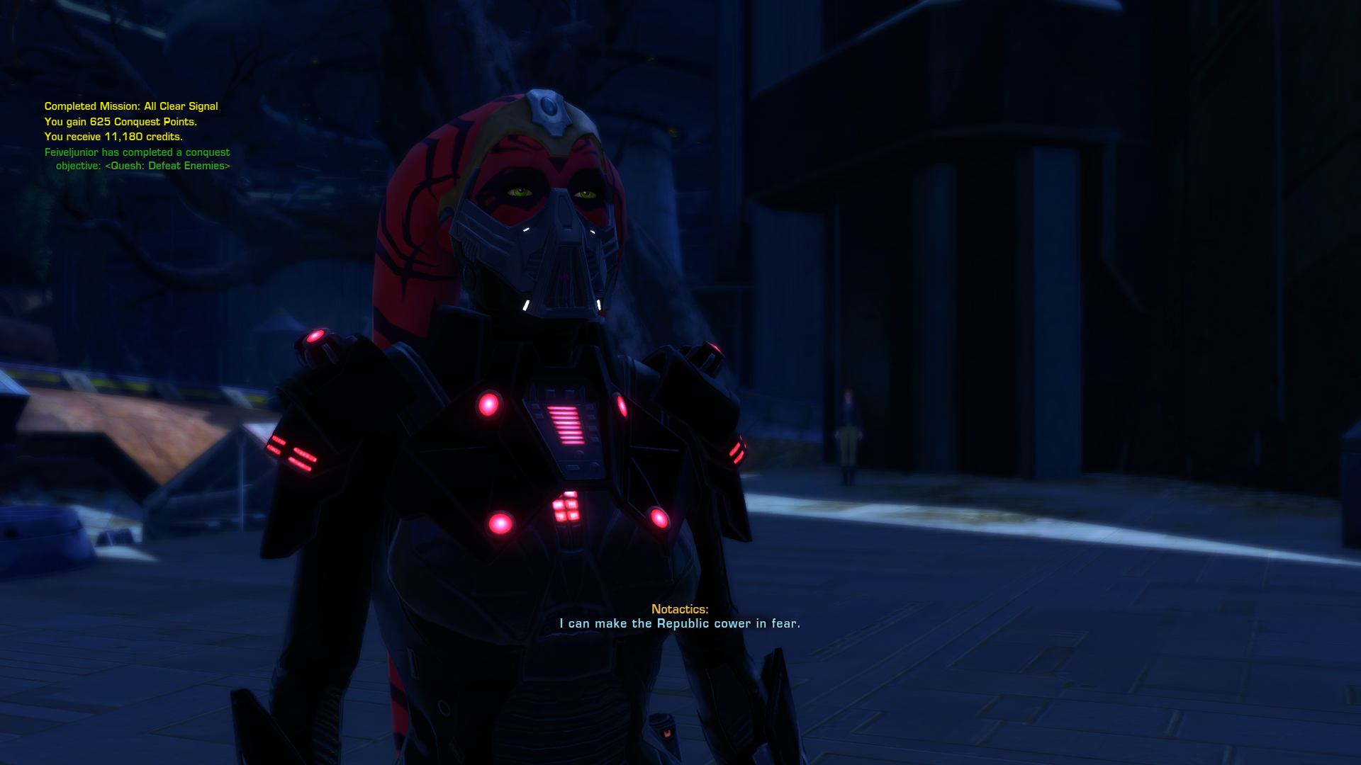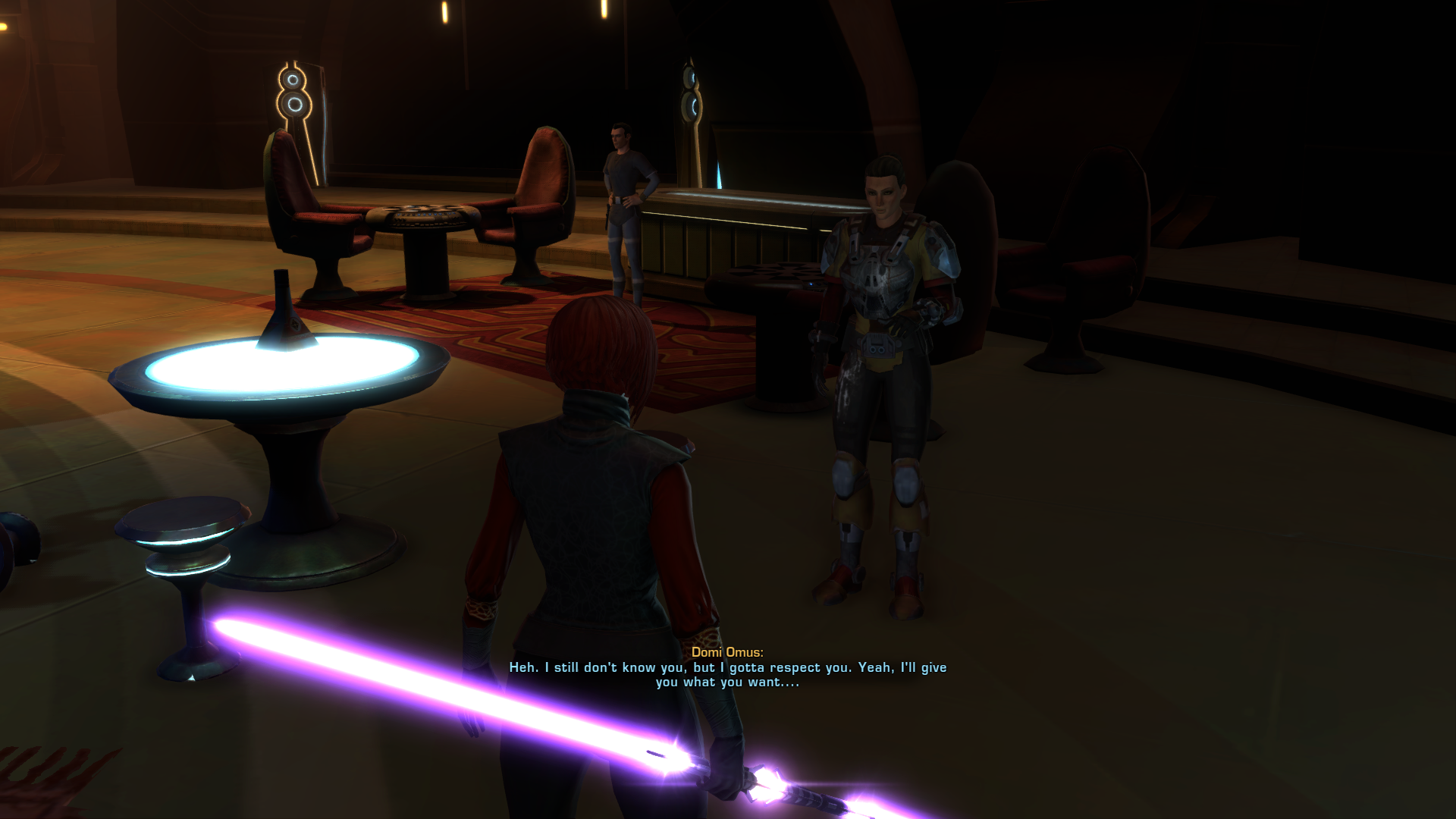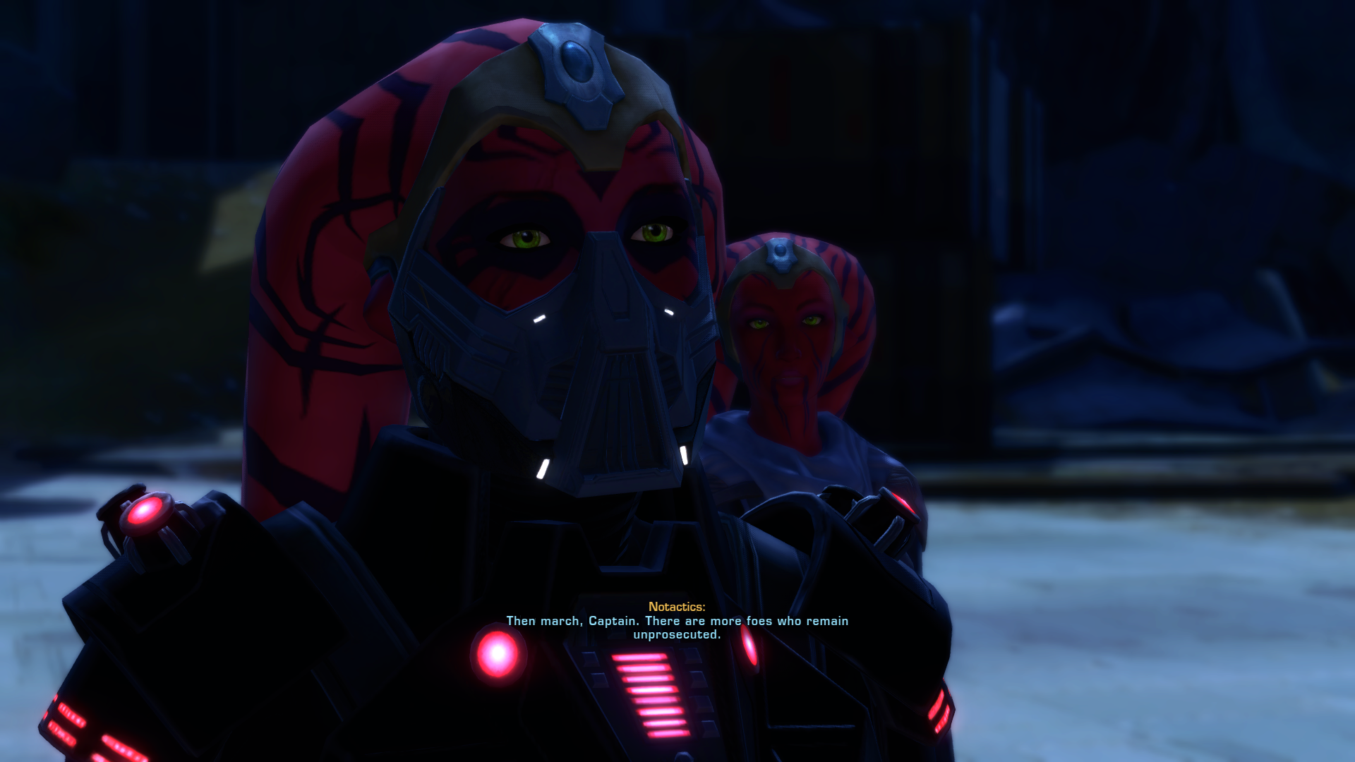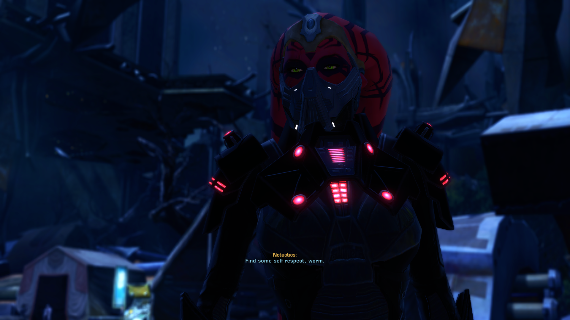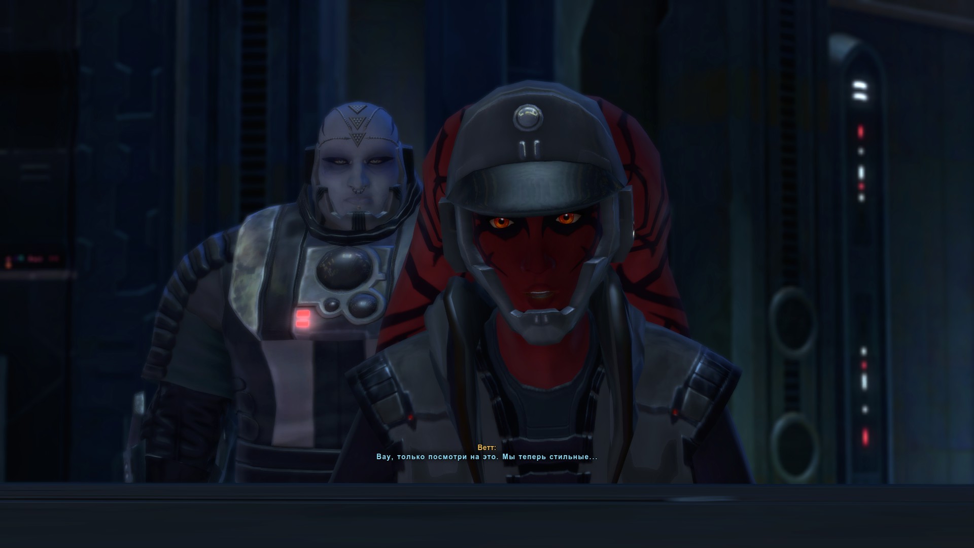 Очень сложно играть за ситха инквизитора после ситха воена. Воен с такими прикольными цепляющими угрожающими интонациями говорил, шутки даже иногда смешные шутил, а актёр озвучки инквизитора унылым голосом чота бубнит, совсем не нравится.