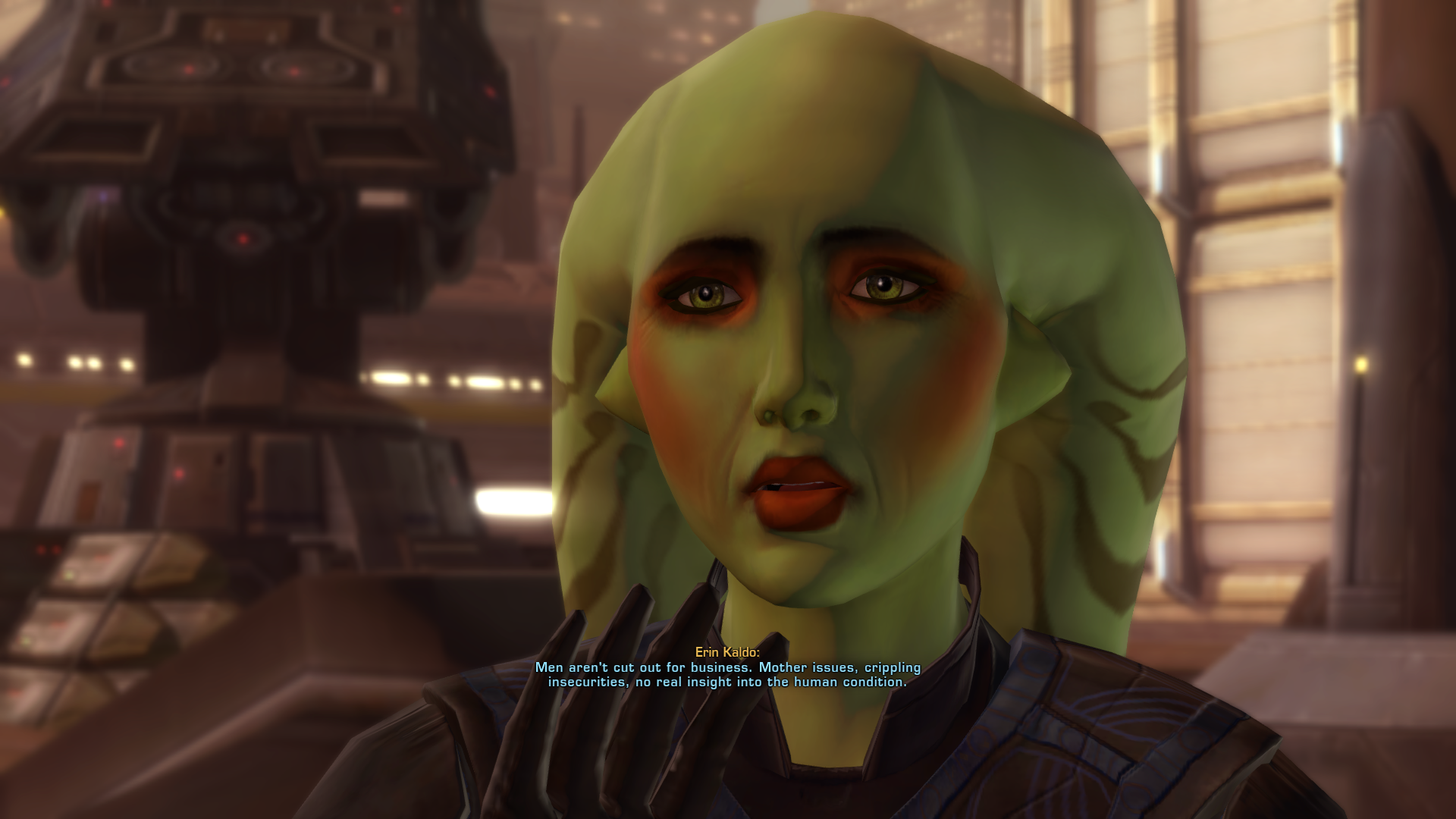 Прохожу сюжетку агента, и как же бесит первая (и пока единственная) спутница, эта лысая Калийо. Прям я до того думал, что топ-1 антипатий у меня занимает инквизиторский Кхем Вал, но нет. Там просто безобидный садист-дурачок из стазис-поля. Глав-сука сопартийцев досталась имперскому агенту. Она яро дизлайкает и делится своим "фи" при любой попытке быть нормальным человеком. Видимо чтобы она не кривила рожу, надо на постоянке поступать как мразь, всех кидать и наебывать. Я тут решил вести себя как Джеймс Бонд, но уже на первом пункте "у джеймса бонда в постели оказываются сексуальные роковые женщины" произошла осечка. И мне подсунули блядь с аолпецией.