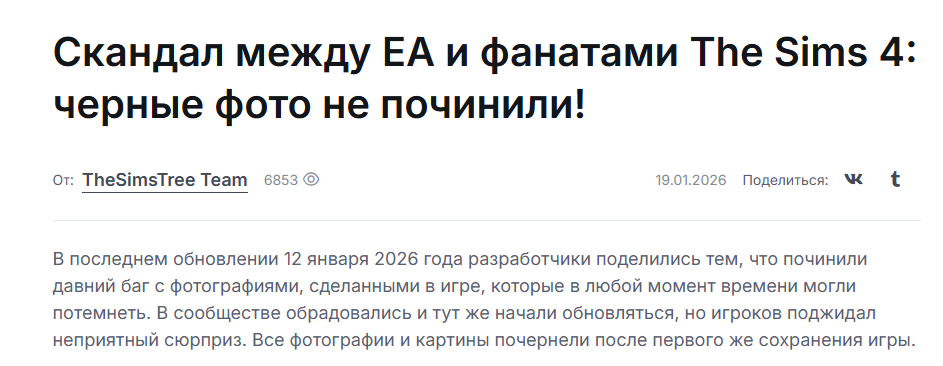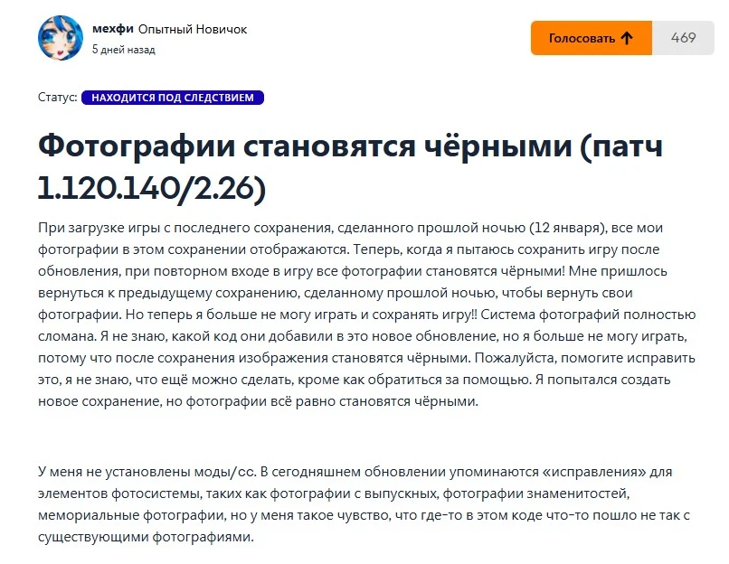 обновился на патч от 13 января с исправлениями ошибок в том числе поганых чернеющих фотографий. Итоги исправлений криворуких имбецилов которые не могут ошибку пофиксить уже целый год. Да что там год, поломанный конкурс талантов в баре за овер дохуя лет так и не исправили. Эта игра самая багованная помойка в мире. Ошибка на ошибке. Патч исправляющий ошибки в итоге их же и добавил.