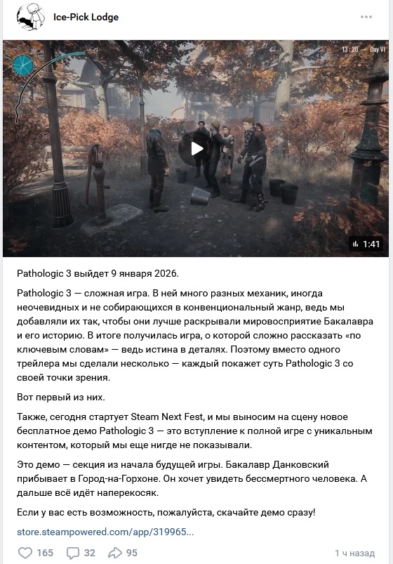 Текущие проекты IPL: • Мор-2, рут Бакалавра Вышла демка, обещают релиз в этом году (АГА) но все всё понимают и ждут в 2026-ом 2-го июля 2022 Дыбовский выкатил полотно текта о том, что рут Бакалавра будет сделан вообще на других механиках и будет гораздо проще рута Гаруспика. Без открытого мира. На начало июля 2022-го разработкой даже не начали заниматься.. • Помни (релиз 10 февраля 2022): store.steampowered.com/app/685670/Know_by_heart • Франц (вышел и забыт). • Нейросказка (разработка прекращена, вместо нее будет какая-то другая игра НемоСоды, ничего по-прежнему нет). • Консольные версии Мора-2 (патчей все еще нет и, видимо, не будет никогда).