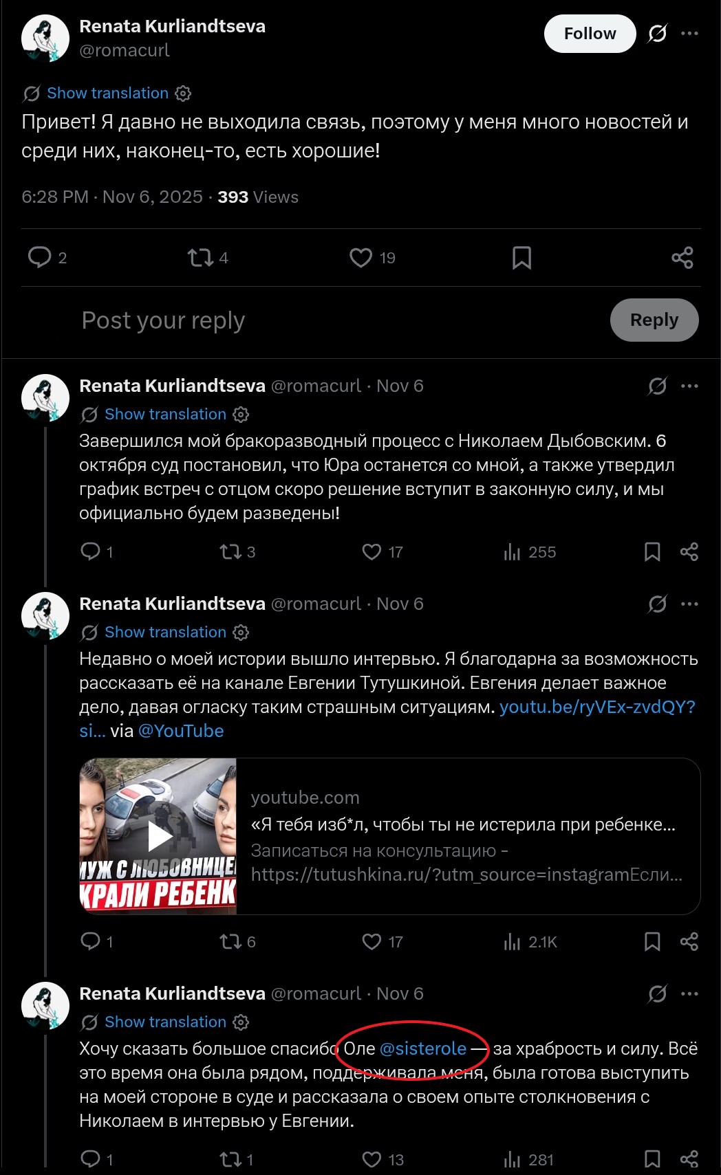 Во-первых, Рената выиграла суд 1 инстанции за сына. Развод вступит в силу с 15 ноября, сын останется с ней. Маэстро, разумеется, подал апелляцию (видимо, пойдет до верховного суда, кек).