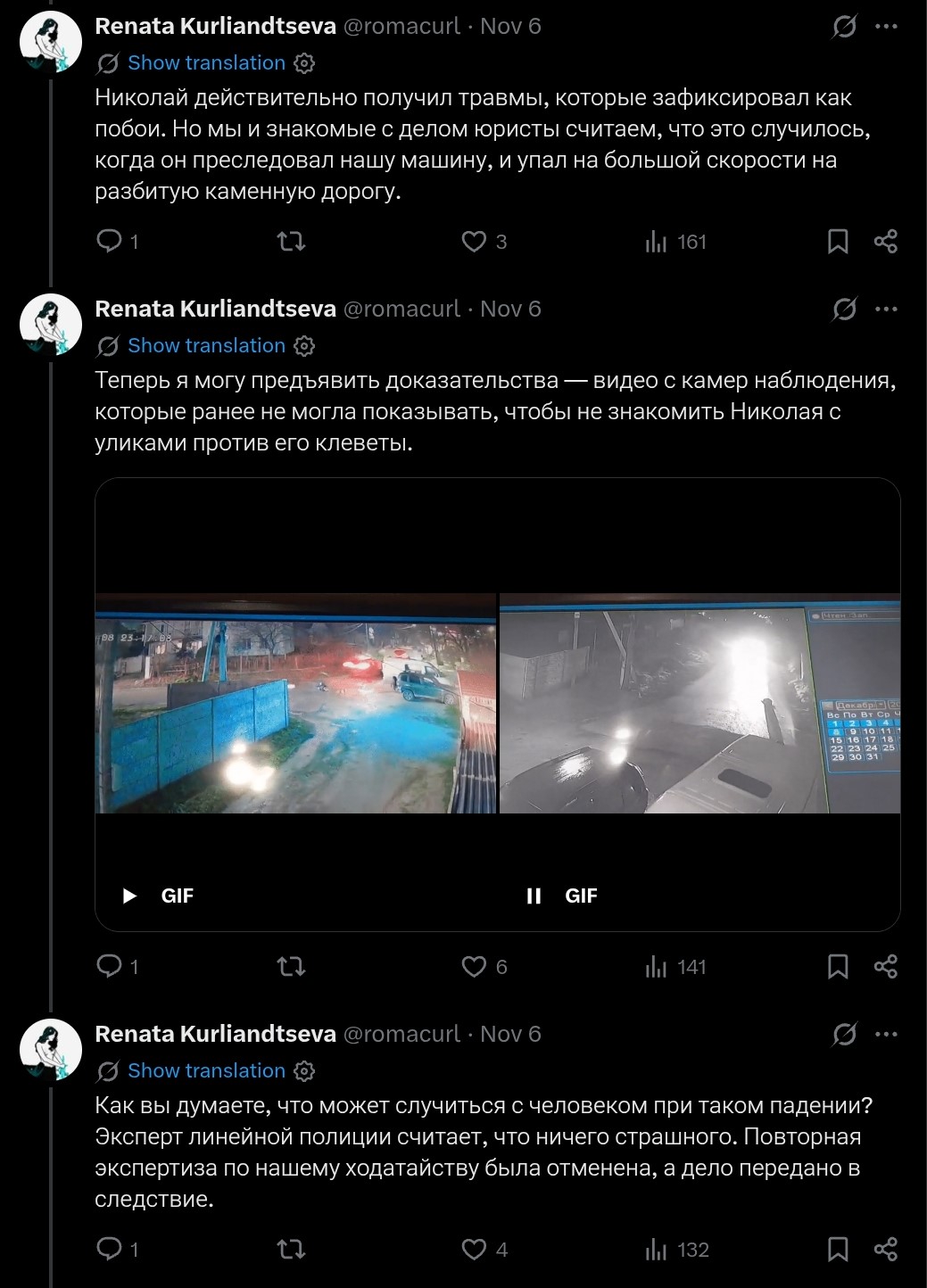 >Уважаемый суд, Россия 24 к нам приехала, как будто мы йеменские хуситы. Какой интерес к нам?! И прямо вот здесь на выходе. И задали два вопроса! Первый вопрос: почему вы украли ребенка? И второй вопрос: почему избили тестя? Мы сказали, это не соответствует действительности и, если хотите поговорить, то можете связаться. Вот мы развернулись и ушли. А Рената Михайловна, отец и Сергей стояли рядом.