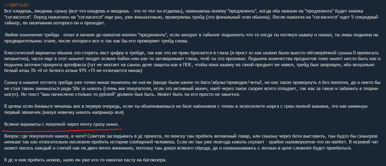 Классический варианты обмана это стереть ласт цифру в трейде, так как это не прям бросается в глаза (я прост хз как можно было вместо обговорённой суммы 0 прописать незаметно), часто еще в этот момент пиздят всякие байки или как-то заговаривают глаза, чтоб ты это прозевал. Подмена количества предметов тоже имеет место быть как и подмена заточки/процента артефакта (тут не хватает на самом деле защиты как в ПОЕ, чтобы пока мышку на такой предмет не навел, трейд был запрещен, ибо визуально белый атом 3% +0 от белого атома 97% +15 не отличается никак)