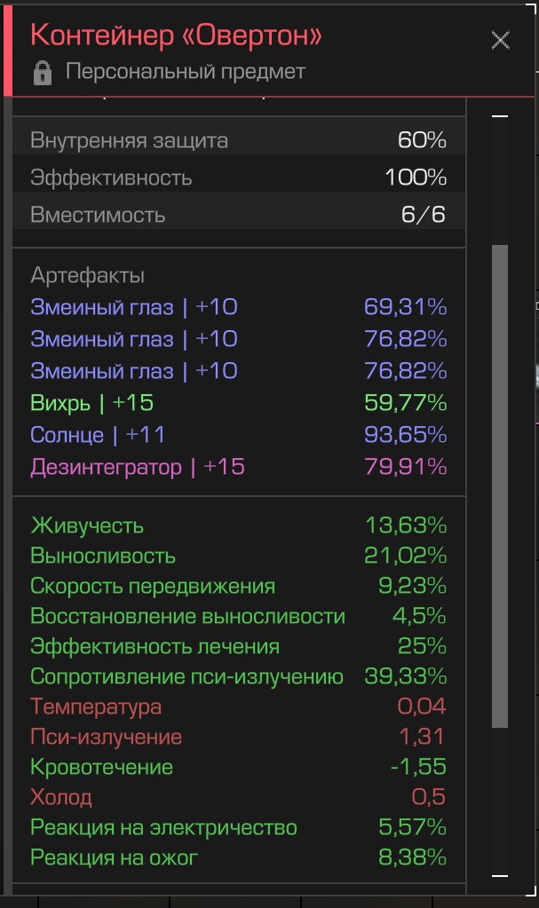 4. Можно на ютубе билды посмотреть по артам, но честно щас ничего кроме зеленых +15 артов на максимум заражения ничего полезного за такую цену нет, оверпрайс говно из-за скупщиков на рынке, ебланы холдят активы и скупают любое особое говно за 4кк+. По полезным артам это: гелий, призма, осколок, браслет, ветка калины (на хил броню), змеиный глаз (на гибрид сборки), мб с натяжкой солнце и спиральки (вес + скорость) конечно же. По контейнерам - нубу рюкзак на +70 веса или +5.7% мс +25 веса, прошаренному Берлогу или Кегу (если бабки есть заполнить слоты)