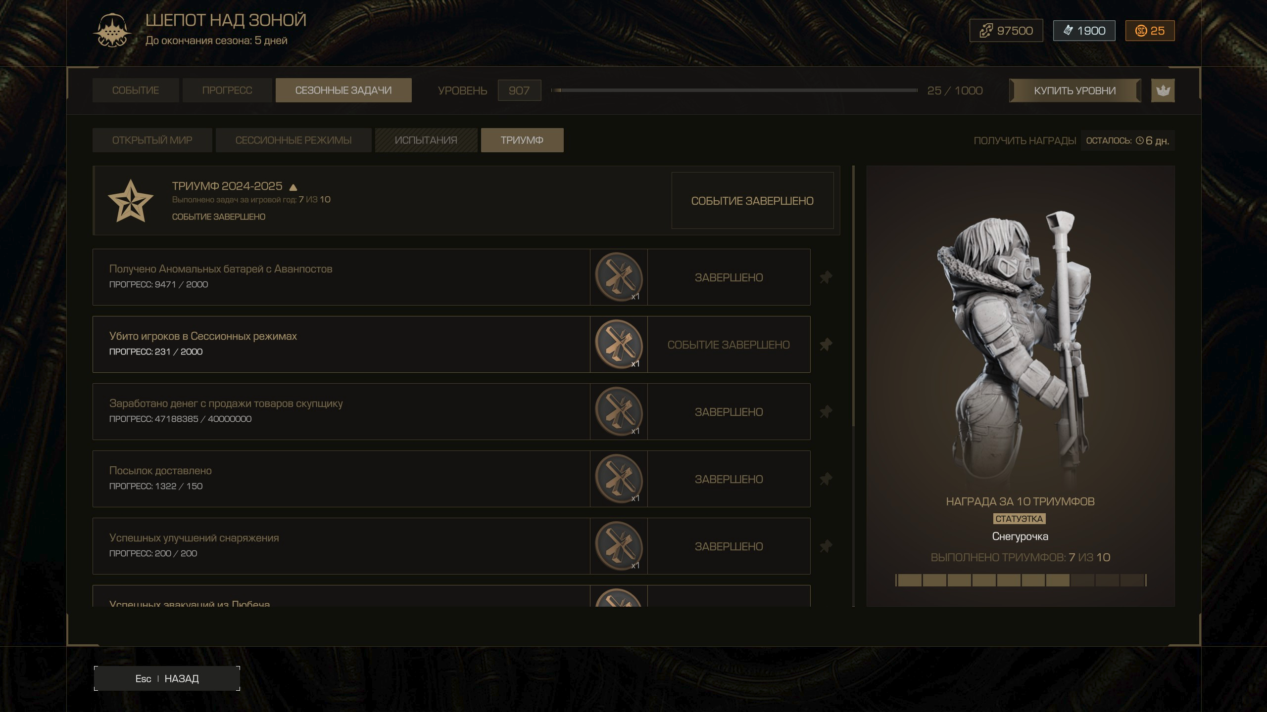 Посередине ивента не придумали ничего лучше, как на ДР запустить свой сраный Триумф. То есть оказывается, что я весь год должен был в обязательном порядке заниматься такими охуительными вещами, как например таскать рюкзаки, собирать минералы, или дрочить Лиманск. А если я этого не делал, то у меня на эти увлекательные мероприятия есть ещё целый месяц. При уже активном ивенте. Хуесосы видимо решили, что раз у них личной жизни нет, то у аудитории её тоже быть не должно. Про награды за всё это великолепие за монеты бати (видимо, компенсация, что долго за хлебом ходил) я вообще молчу. Особенно про всратый мотив брони, который самый дорогой, и про кейс, в который жадные мудаки даже не придумали, что засунуть, поэтому нарративно навалили, что для него взломщик мохнатого сейфа нужен. Вангую, они ещё и отдельный квест для его открытия впихнут.