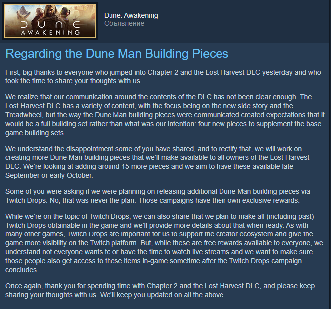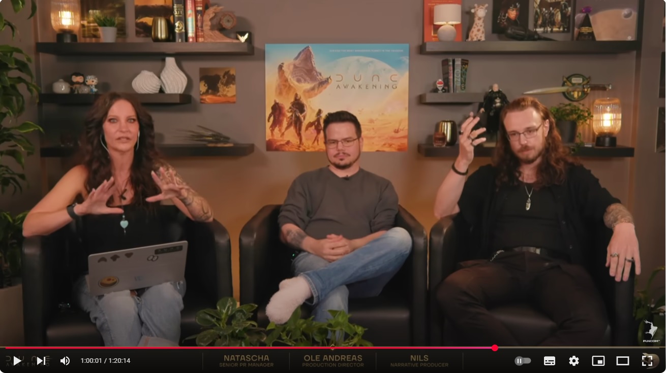 Пачноуты с тестового сервера: https://duneawakening.com/news/public-test-client-version-1-2-0-0/ >рпг теперь самонаводящийся и доступен с дюралюминия >грузовой отсек штурмового топтера теперь 20 слотов и 2000 объема >червь больше не выпрыгивает прямо на людях или транспорте >по завершению миссий наставников дают броню+скин класса >сюжетка в дд >можно пересаживаться в транспорте на другие места с помощью Ф1-Ф8 >интерфейс орнитоптера более видим