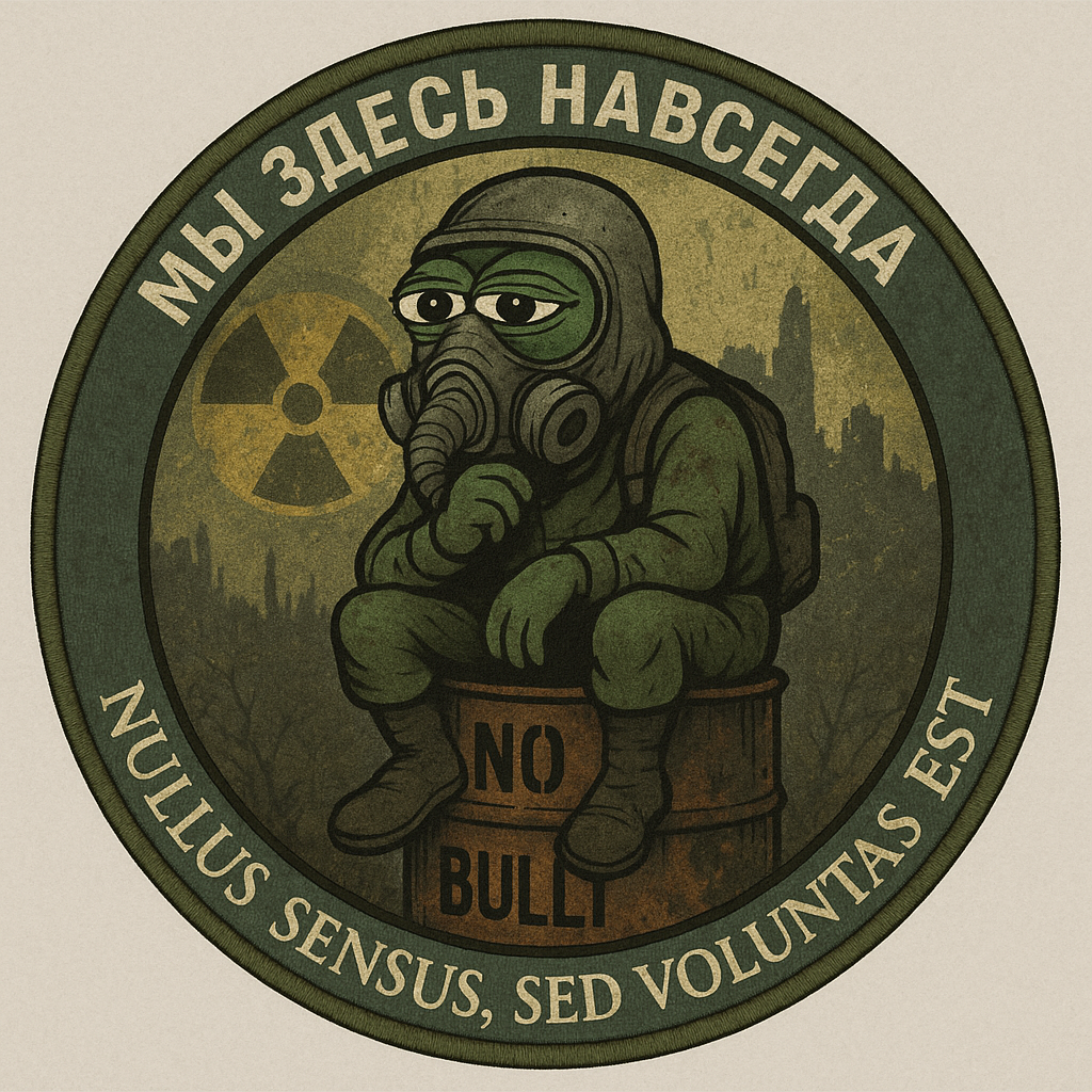🧷 Шеврон: Щит с изображением лягушки Пепе в противогазе, сидящей на ржавом бочке с надписью "NO BULLI". На фоне — выцветший знак радиации и силуэт Зоны. Сверху полукругом надпись: