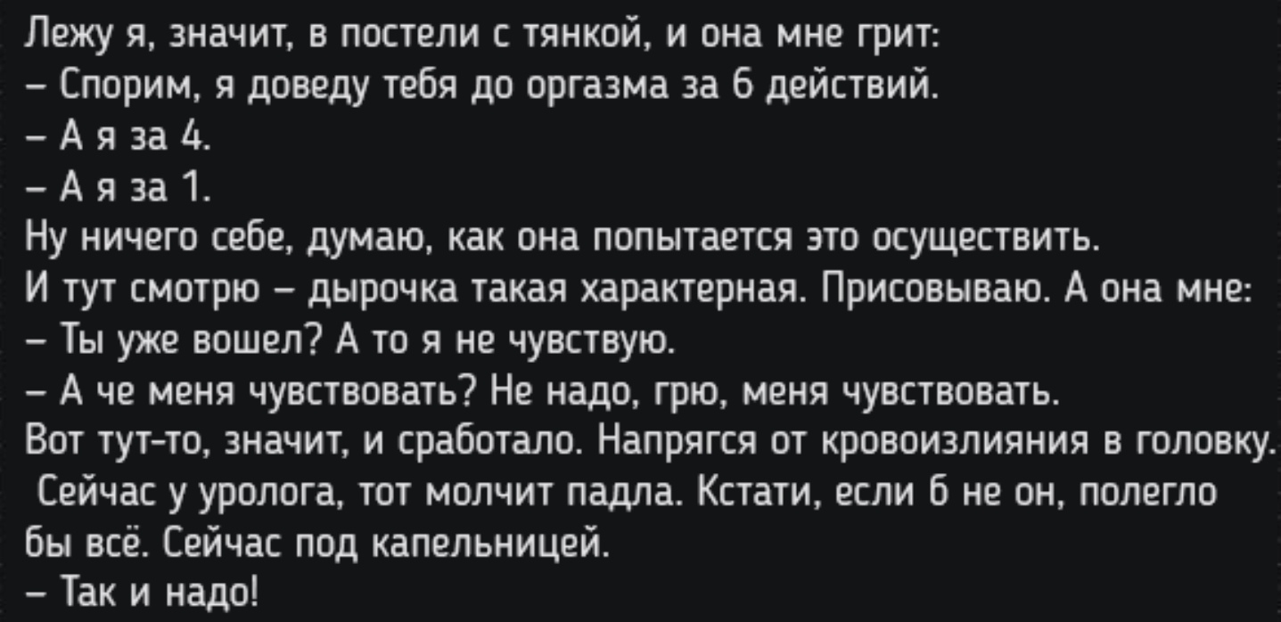 Смотрю, вмятина между ног характерная. Ну я и вошел в нее. А она грит, Ваня, я тебя не чувствую, ты куда это делся. А я ей: а че мня чувствовать? Не надо меня чувствовать. Ну и тут всякая шелуха полетела: шишки, леска. Ну я рванул сразу, с блокпоста сейчас куча народу набежит. Нда. А трусы её я с тех пор с собой тягаю. Кстати, если б не они, все полегли бы. Что-то типа инкапсулированное на уровне пси-фона... Плотнее урана в пять раз, грят.
