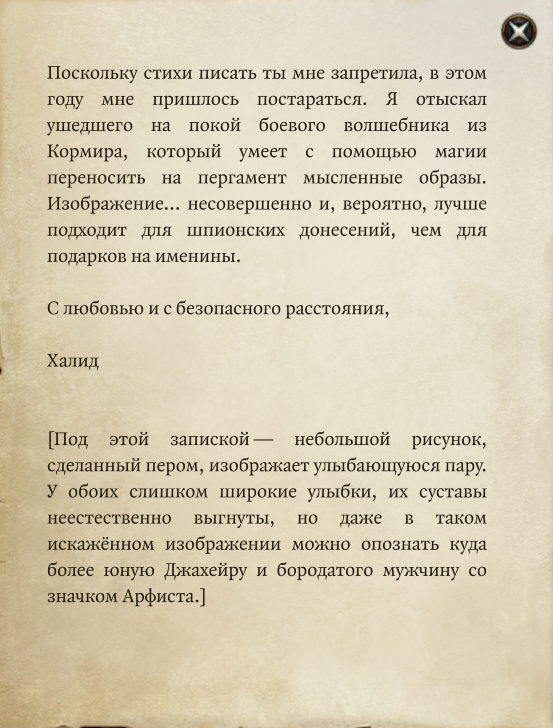 Мне с Джахейрой первый диалог в таверне понравился. Я в первые части не играл, ток видик смотрел, да на вики шарился. Но как понял, там есть на них отсылки. Когда за барда с ней базаришь, она говорит о своём прошлом нечто вроде: "барды разную хуйню поют, одни что я убийца чудовищ, другие что я сними сплю, все правды мы не знаем." Это видимо такая пасхалка, на плохую и хорошую концовку в игре. Прикольно.
