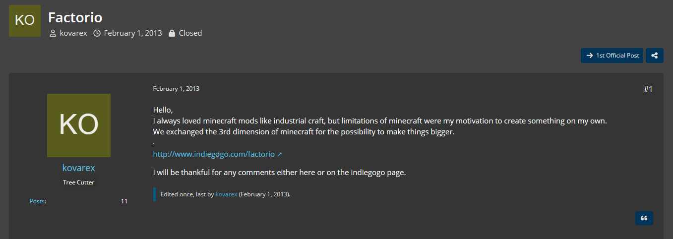 >>50231554 Разработчик факторио стал делать игру на основе своих собственных добавлений в моды майнкрафта (IndustrialCraft2/BuildCraft). И даже пиарил игру на форуме этих модов в 2013.