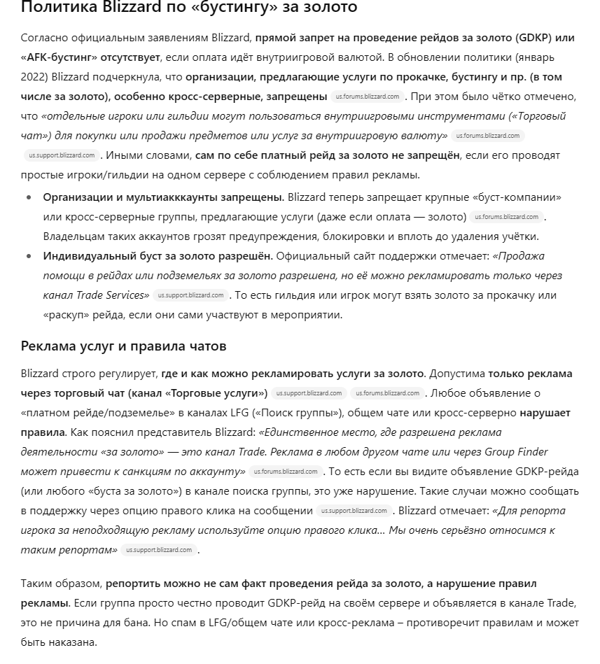 Вывод: «Gold-bit» рейды и AFK‑услуги за золото не запрещены сами по себе, но их организаторы должны строго соблюдать правила рекламы (только торговый чат, без кросс-рекламы). Если же они нарушают эти правила (например, спамят в ЛФГ/чате общей), то такое поведение можно и нужно репортить. Запрещено лишь привлекать к этим услугам реальную валюту (RMT) или использовать недопустимые методы (боты, скрипты) – за это Blizzard действительно может наказывать.
