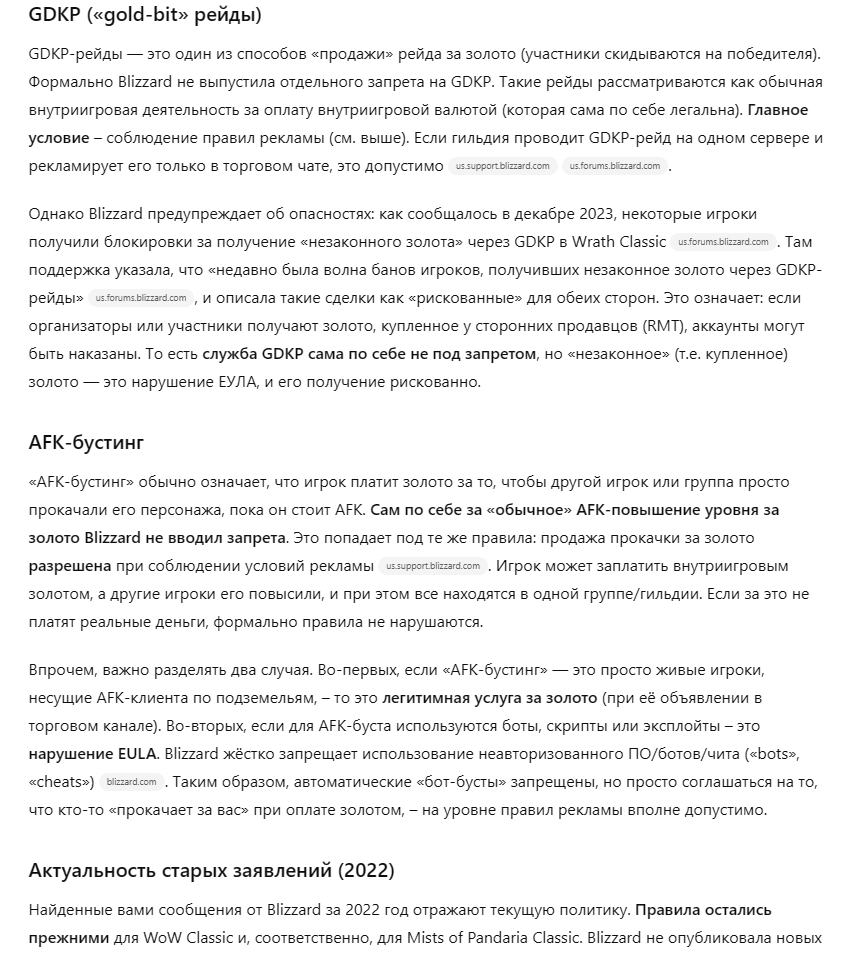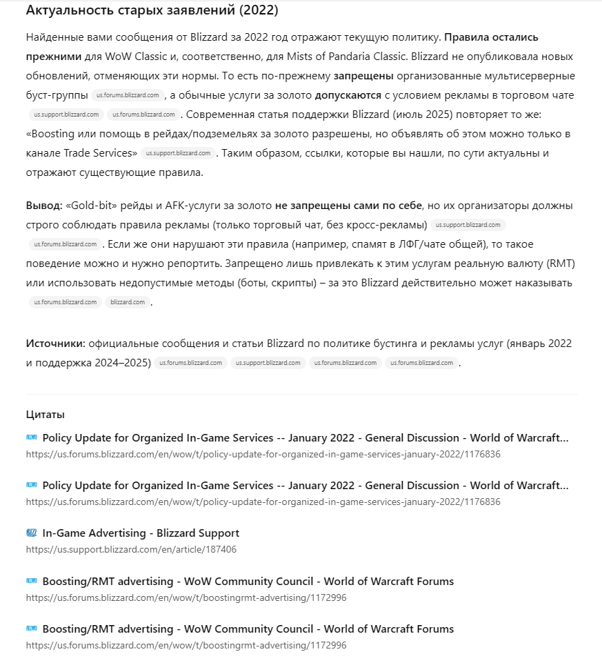 Найденные вами сообщения от Blizzard за 2022 год отражают текущую политику. Правила остались прежними для WoW Classic и, соответственно, для Mists of Pandaria Classic. Blizzard не опубликовала новых обновлений, отменяющих эти нормы. То есть по-прежнему запрещены организованные мультисерверные буст-группы, а обычные услуги за золото допускаются с условием рекламы в торговом чате. Современная статья поддержки Blizzard (июль 2025) повторяет то же: «Boosting или помощь в рейдах/подземельях за золото разрешены, но объявлять об этом можно только в канале Trade Services». Таким образом, ссылки, которые вы нашли, по сути актуальны и отражают существующие правила.