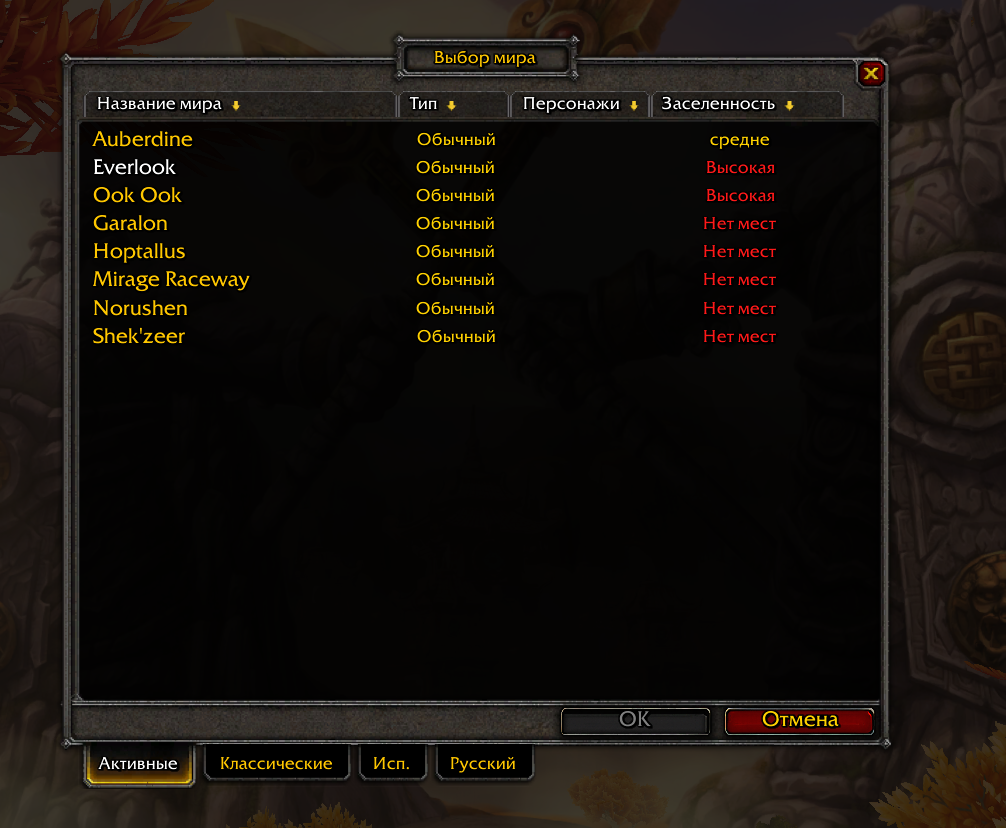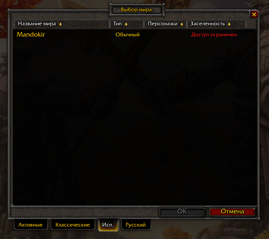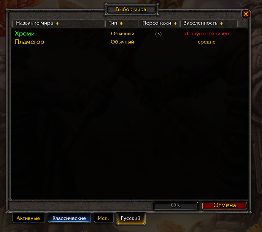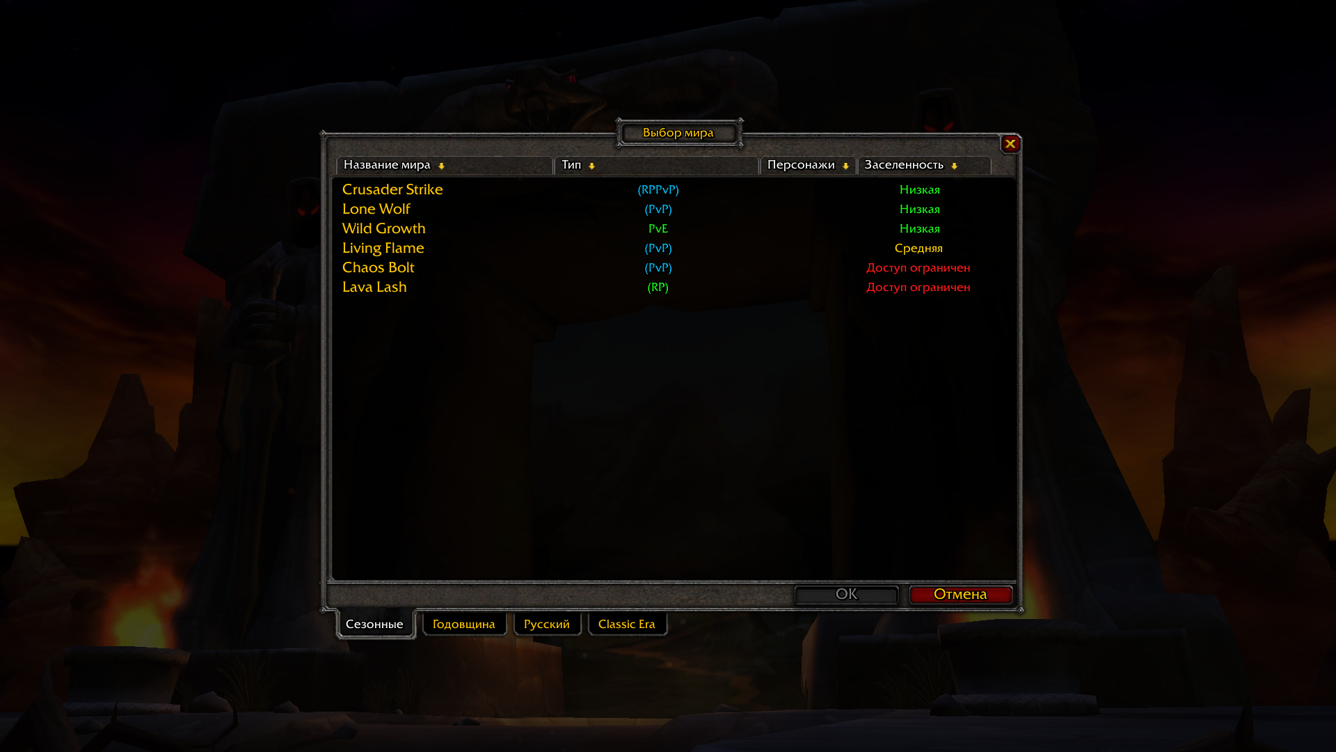 Оплатил подписку и как всегда через неделю желание играть пропало, еще и рхгайд сломался на сервере годовщины, вот думаю где побегать, на хроми вариант вкатиться? С учетом, что нет опыта в пандарии и пве серверах? Зашел на еу сервера где были чары, там пустые сервера.