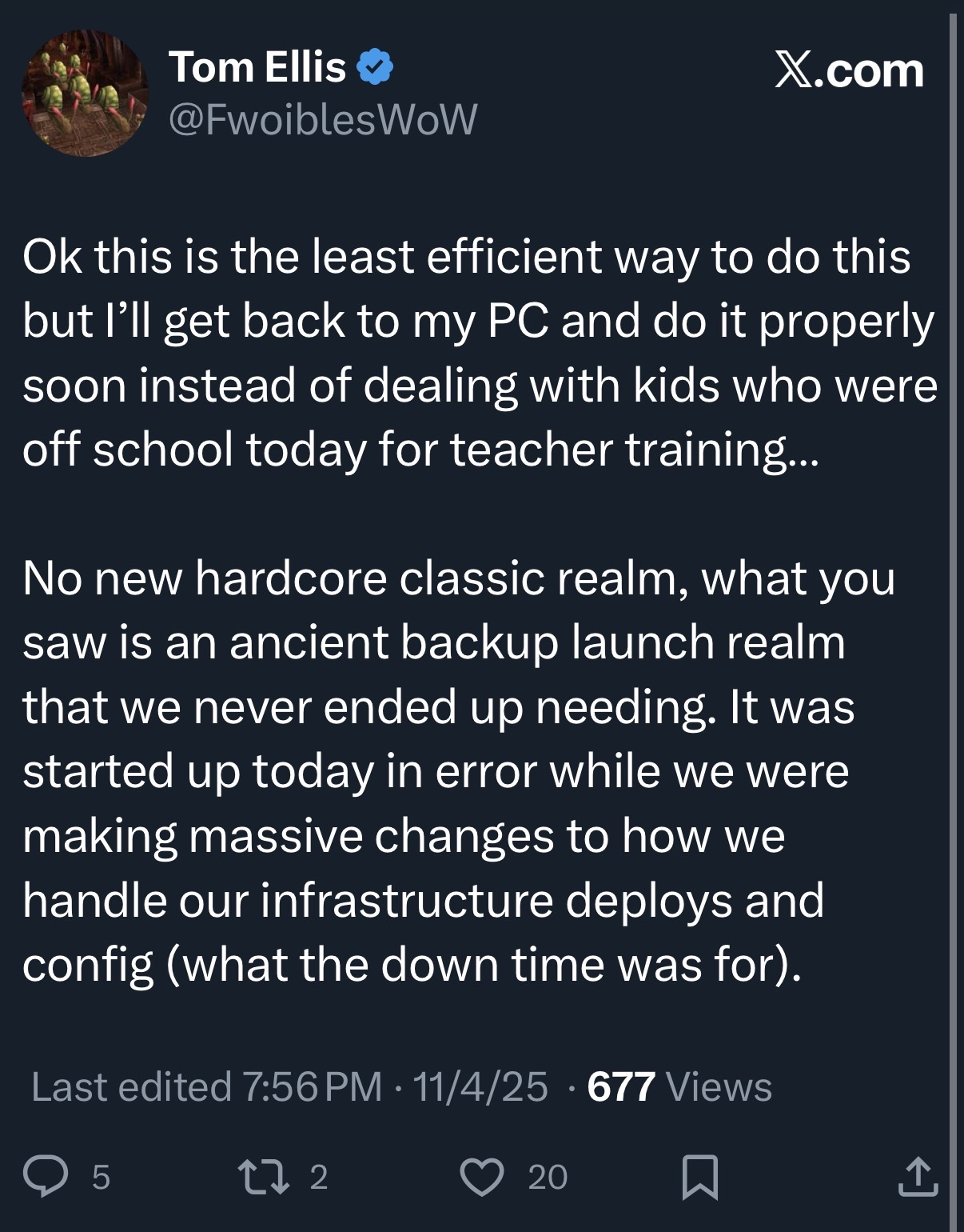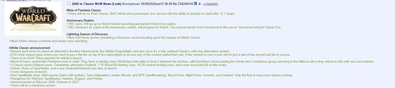 >>50389648 Это достоверный слив потому что все так как я предсказывал - дренора не будет, мердж с ретейлом, классик плюс Единственное что удивило это бк хардкор
