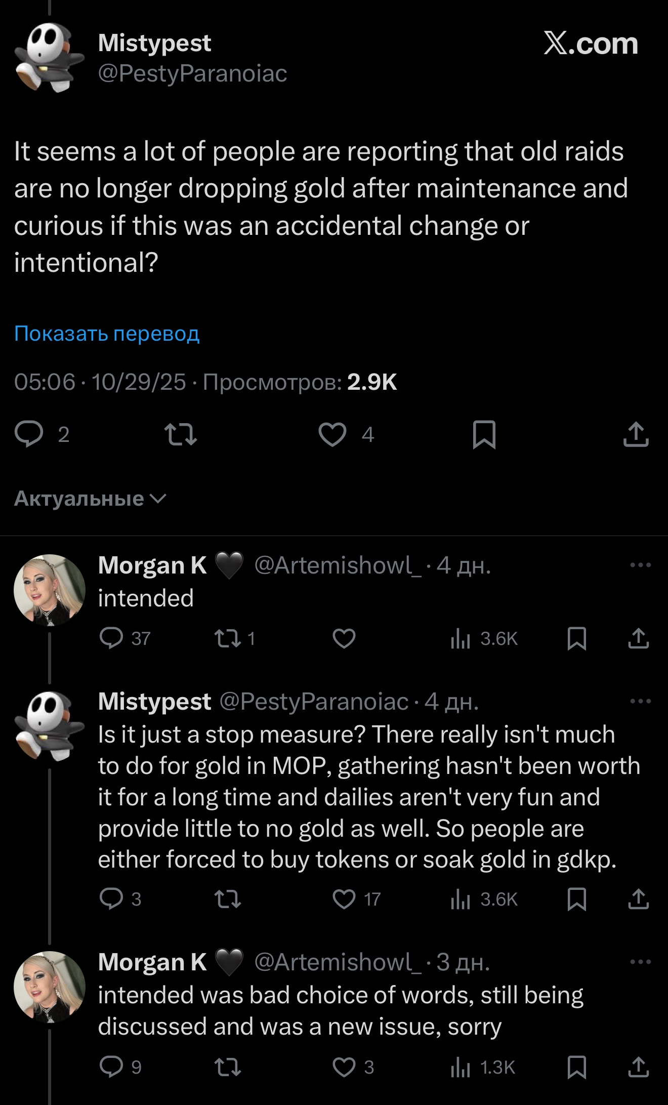 >>50392589 Фармят, иначе бы никто не возмущался из-за отсутствия голды в соцсетях и ее бы не вернули. А так написали, что это баг и случайность, хотя ранее сотрудница близзов в твиттере писала, что убирали голду из бк рейдов намеренно