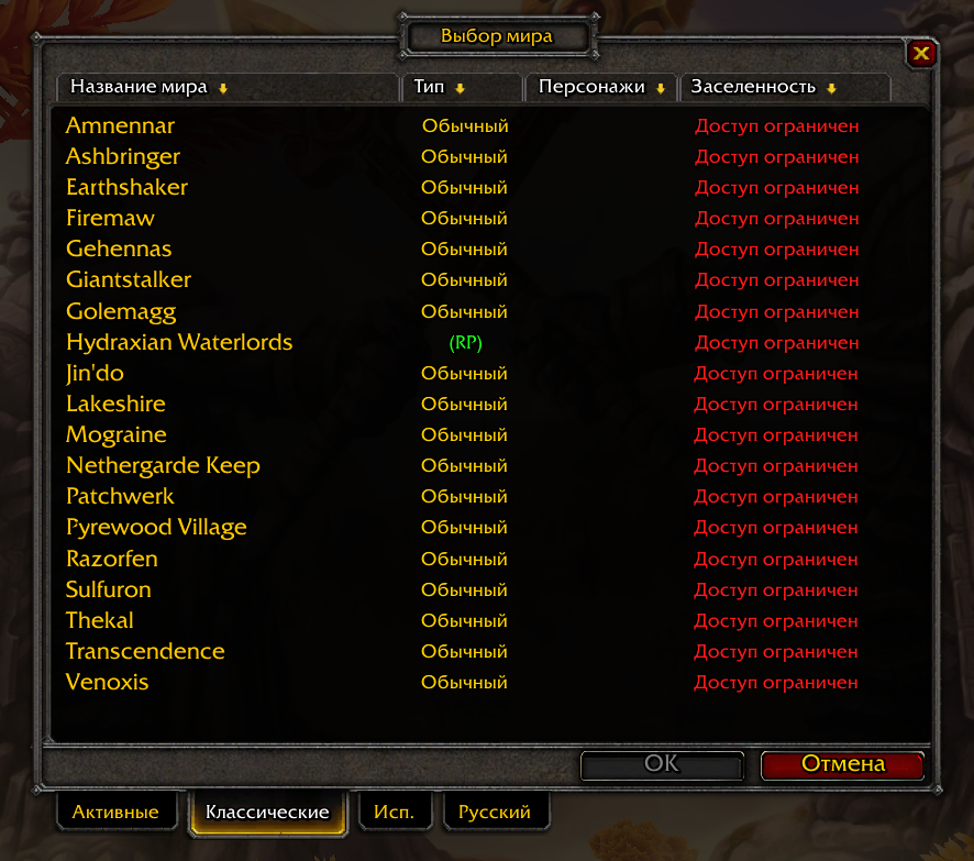 Зашел покачаться на годовщину (русский сервер anniversary, который даже не удостоили нормального лорного названия). В /4 срутся гм эшелона с какими-то местными шизами и бабой. Аукцион полупустой. Но зато все на русском. Сюда бы онлайн хотя бы тысченку, глядишь можно было бы лампово поиграть в бк на русском языке.