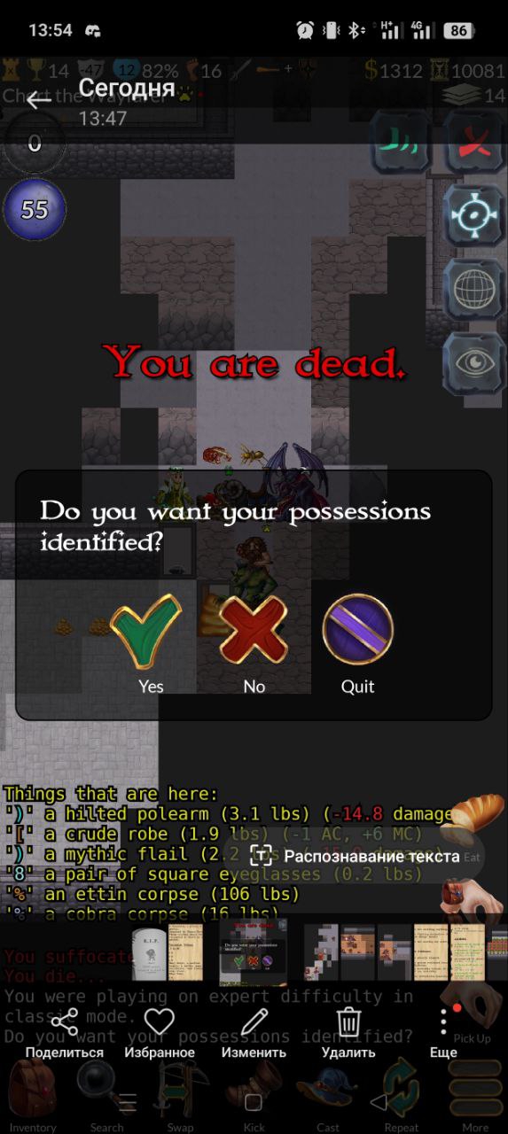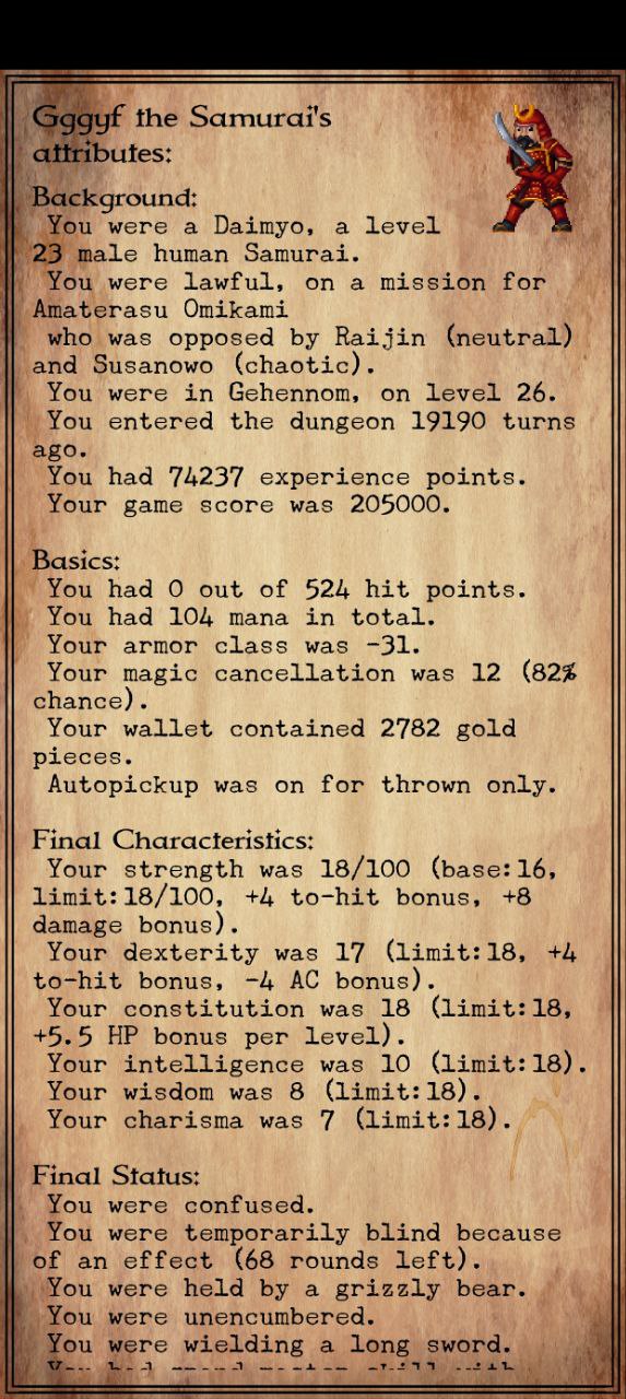 >>50093611 Бля, а так ахуенно все начиналось... Нашел кольцо на +25%хп и пояс на +50%хп и кольцо с резистом к яду. Спустился в гномьи шахты, там тоже все относительно неплохо шло. Облом разве что с тем, что тачстоун не выпал и была куча неопознанных гемов. Зато жратвы было много, всяких грибов и зелий налутал, но неопознанное все( А из-за гемов денег мало и в городе ничего особо не купил. Дошел до последнего уровня шахт и на обратном пути на меня напал допльгангер и я сдуру решил его туп сожрать и превратился в нагу хачлинга. Пока шел в этой форме на меня напала мумия и заразила( Пидарастических бог отказался мне помогать и лечилок никаких не было, так и сдох от гангрены( Обидно. Больше не буду жрать что попало.