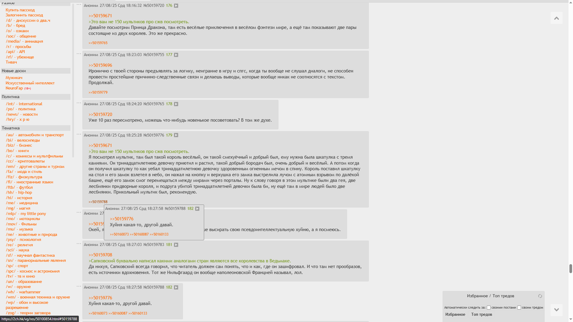 >>50158777 Так вот он какой - легендарный троллинг тупостью... >>50158859 Да тут один ненавистник одного народа, который тоже любит чубы на голове, только против него и топит. Я и сам с ним срался, и видел что другие срались. По факту всё верно, каким Ольгерд не был, отдавать его душу дьяволу - это не-ведьмачьи.