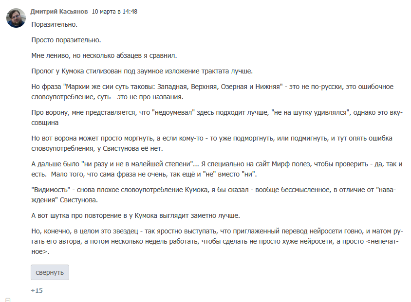 Прозреваю, что Кумоковский перевод будет самым хуевым в истории ру сообщества. Кто нибудь его перекресток воронов читал? Как там по сравнению с Соловьевым?