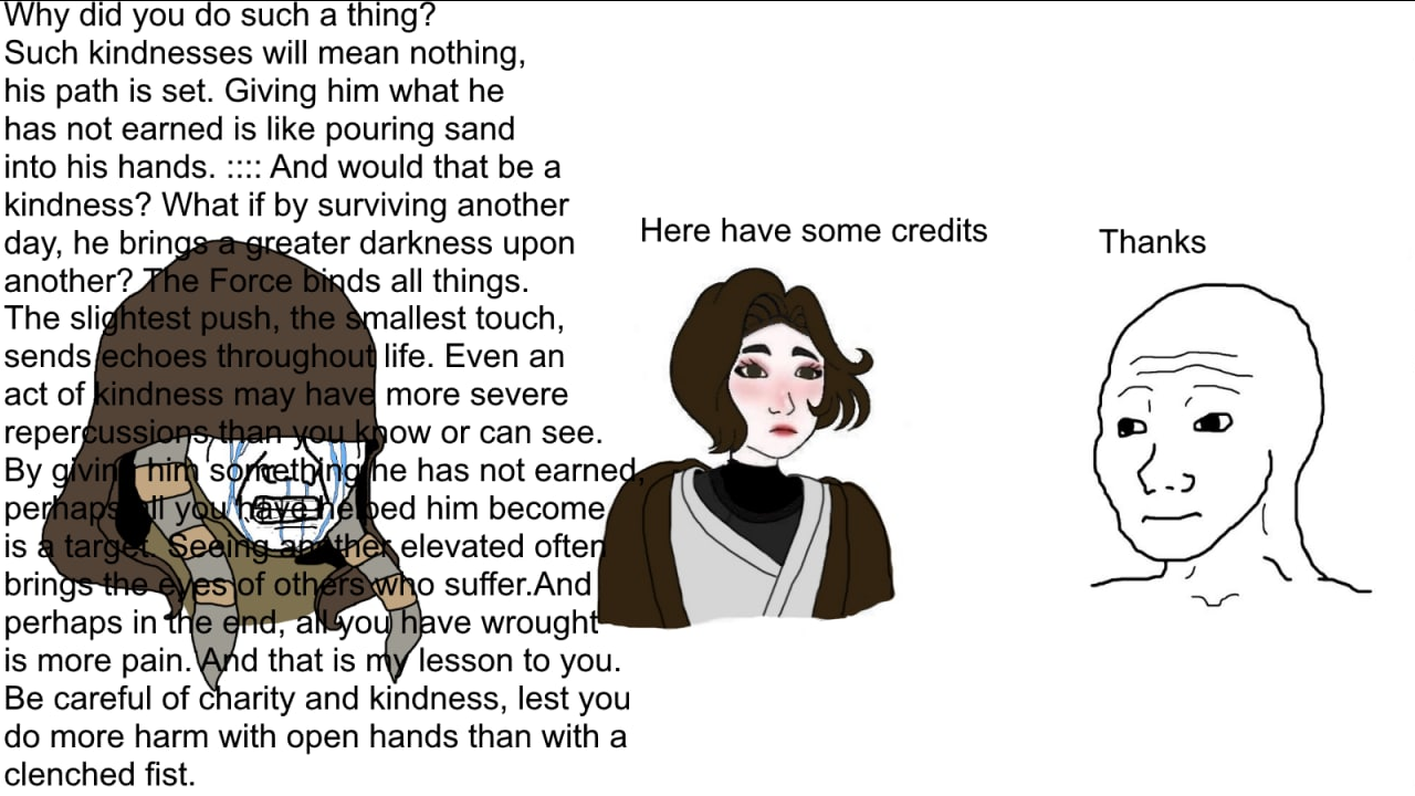 Вот серьёзно, я когда молодым и наивным проходил, верим ему, принимал это всё за чистую монету. Как же на него всё навалилось, а он ведь так старается, а его только толкают глубже в пропасть, но он же поймёт урок и всё сделает как надо. А теперь, реально насмотрелся на литералли него - не, ни хрена, видели уже этот путь, в точности. Опять пойдут какие-нибудь отмазки, отговорки, "вот до той кочки доедем и брошу", в Каэдвене опять какая-нибудь напасть найдётся, которая не будет давать ему нормально жить просто тем, что существует. Но с Анной они действительно два сапога пара - вполне верю ему, что она его хуесосила специально, и не только чтоб ему плохо было (ей от этого хорошо станет), а и чтоб он её реально бил (тогда она сможет жалеть себя и ей будет хорошо от того, что она - жертва, а виноват он).