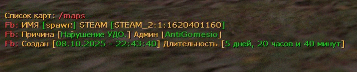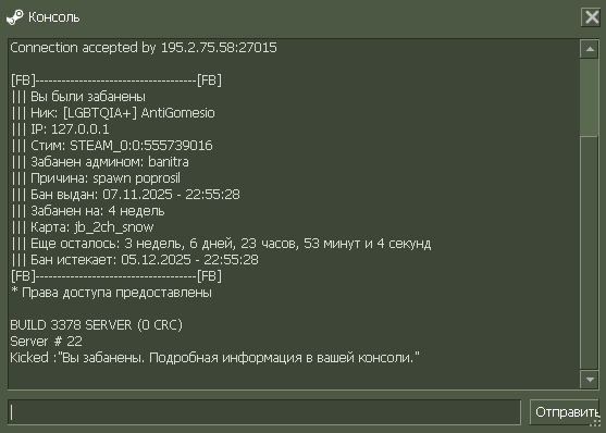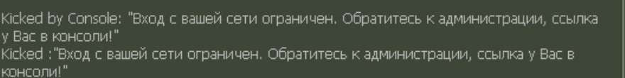 ВАШИ НИК STEAMID И IP STEAM 2:0:1037639920 ЕСЛИ ДОСТУП БЫЛ ОГРАНИЧЕН ПО ОШИБКЕ СООБЩИТЕ ОБ ЭТОМ ЗДЕСЬ T.ME/QTR4S KICKED BY CONSOLE ВХОД С ВАШЕЙ СЕТИ ОГРАНИЧЕН ОБРАТИТЕСЬ К АДМИНИСТРАЦИИ ССЫЛКА У ВАС В КОНСОЛИ