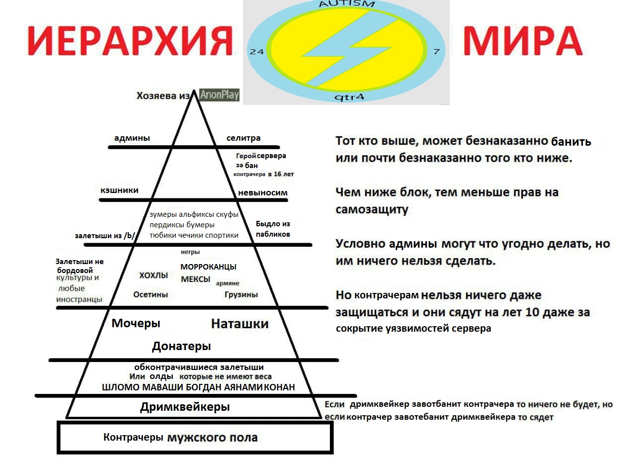 >>50501668 Пока сервер хостится в РФ - на него будут распространятся законы и правовая культура РФ. В следствии этого иерархия игроков на сервере будет выстраиваться в соответствии с иерархией русского мира. Найти своё место в иерархии, как и место другого игрока, можно сверившись с "пирамидой".