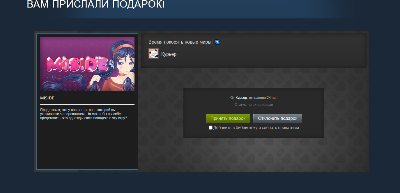 >>50123759 (OP) Всё ещё орирую с того, что из-за мисайда и ещё одной игрушки я решился на выход из отношений длиною в семь лет. Ни о чем не жалею, только рад. Разве что расстаться стоило намного раньше.