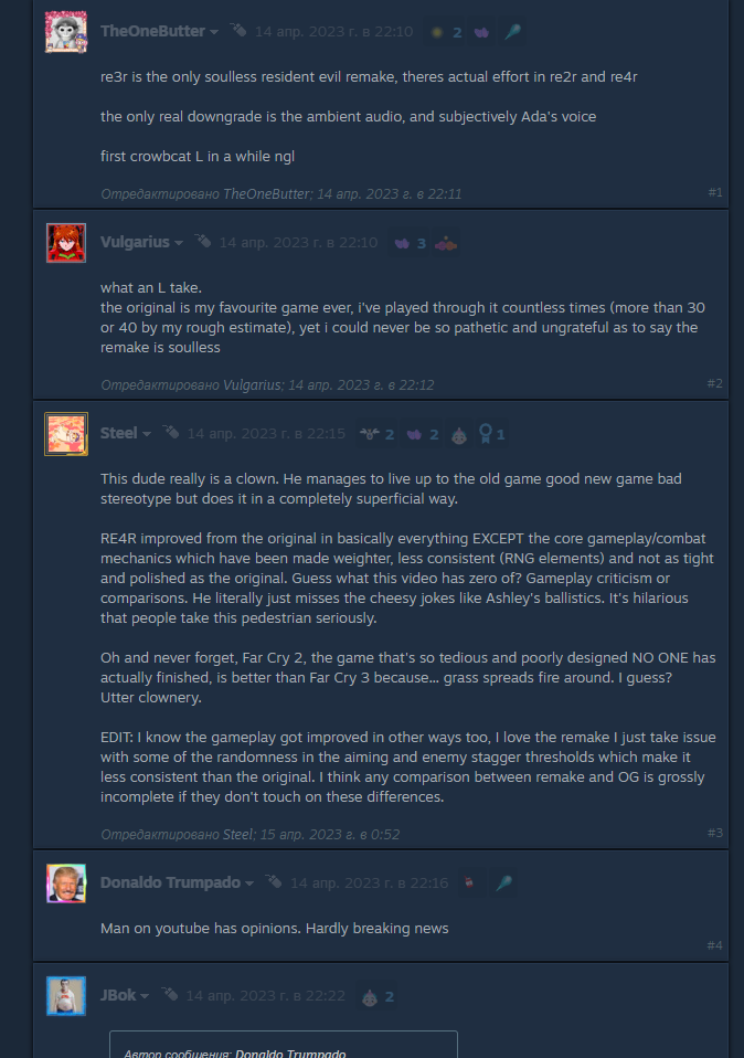 >>50627602 Объясняю тебе, деревенскому ганадычу пикрил - оригинальное название и описание, потом он переименовал и перезалил soul vs soulless, что бы собрать побольше просмотров, а ты, деревенский васян, увидел ЫЫЫЫ ЗАМОРСКИЙ БАРЕН СДЕЛАЛ ВИДЕВО, ТЕПЕРЬ МНЕ НАДО ДУМАТЬ ТАК ЖЕ и купился на эту хуйню, хотя с этим описанием и названием сам видос оставался прежним и ничего в нём не менялось. А такие как ты побежали радостно хлопать. По факту пиздлявый ютубер завертел жопой, чтобы набрать просмотров, а ты это схавал. И да, на этом видео каждый фрагмент с ре4ремейк выглядит лучше. Причём в этом видео специально заглушен звук в РЕ4 и большинство тейков урвоня "ЭШЛИ НЕЛЬЗЯ ТРУСИКИ СМОТРЕТЬ, ГОЛОС АДЫ ПОМЕНЯЛИ, ЛЕОН БОЛЬШЕ НЕ ПЕТРОСЯН" А теперь смотри, если ты, село, умеешь в англ язык https://steamcommunity.com/app/2050650/discussions/0/5440953210416874257 Обоссан в комментах в стиме https://gamefaqs.gamespot.com/boards/369498-resident-evil-4/80412436?page=1 Ветка на геймспоте в целом обоссан, с небольшими кукареками https://www.resetera.com/threads/soul-vs-soulless-resident-evil-4-comparison-crowbcat.708773/ Резетера - обоссан в комментах полностью То же самое везде, где он сам не может удалять комментарии, реддиты, хуеддиты, форчаны. Ты просто норма-мимокрок в таких вопросах забайтился на ЫЫЫ ЮТАБЕР ГАВАРИТ без капли сосбтвенного мышления. Это нормально для ганадо Я бы тебе рекомендовал больше не позориться в треде и идти в бинго поиграть, ганадыч