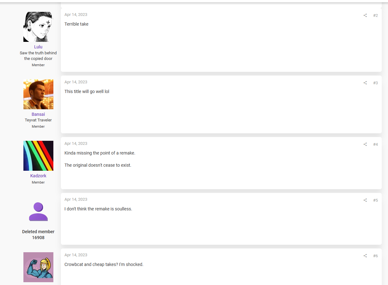 Смотря на геймплей и трейлеры девятой части че-то ваще не вызывает восторга. Опять будет поделка на уровне седьмой части и вставленные сегменты из ремейка четверки за Леона. Ммм, клас васянка. Леон выглядит не очень, внешность ему сделали всрато. Да и вообще скучаю по таким частям как Revelations, жаль ушли от этого формата окончательно и делают рескины семёрки просто на постоянной основе. Реально это заебало, я проходил семёрку, восьмёрку, ремейк двухи, четверки, да они мне скоротали вечерки, но если вспоминать, то это реально одна игра. Я бы хотел сказать что ремейк это не восьмерка, ведь там есть парирование и удар с ноги, но так и хули толку? Все остальное из восьмерки и двухи, и это ватное на льду перемещение персонажем, которое не идёт в формате экшона, как и эта дебильная система рандома урона, которая подкручивается в зависимости от умений игрока и наказывает за скил.. Хуй знает короч я не жду девятку, выйдет и выйдет, гляну, выглядит серо и уныло. Мб чё нибудь лучше высрут с ремейком Кода Вероники.