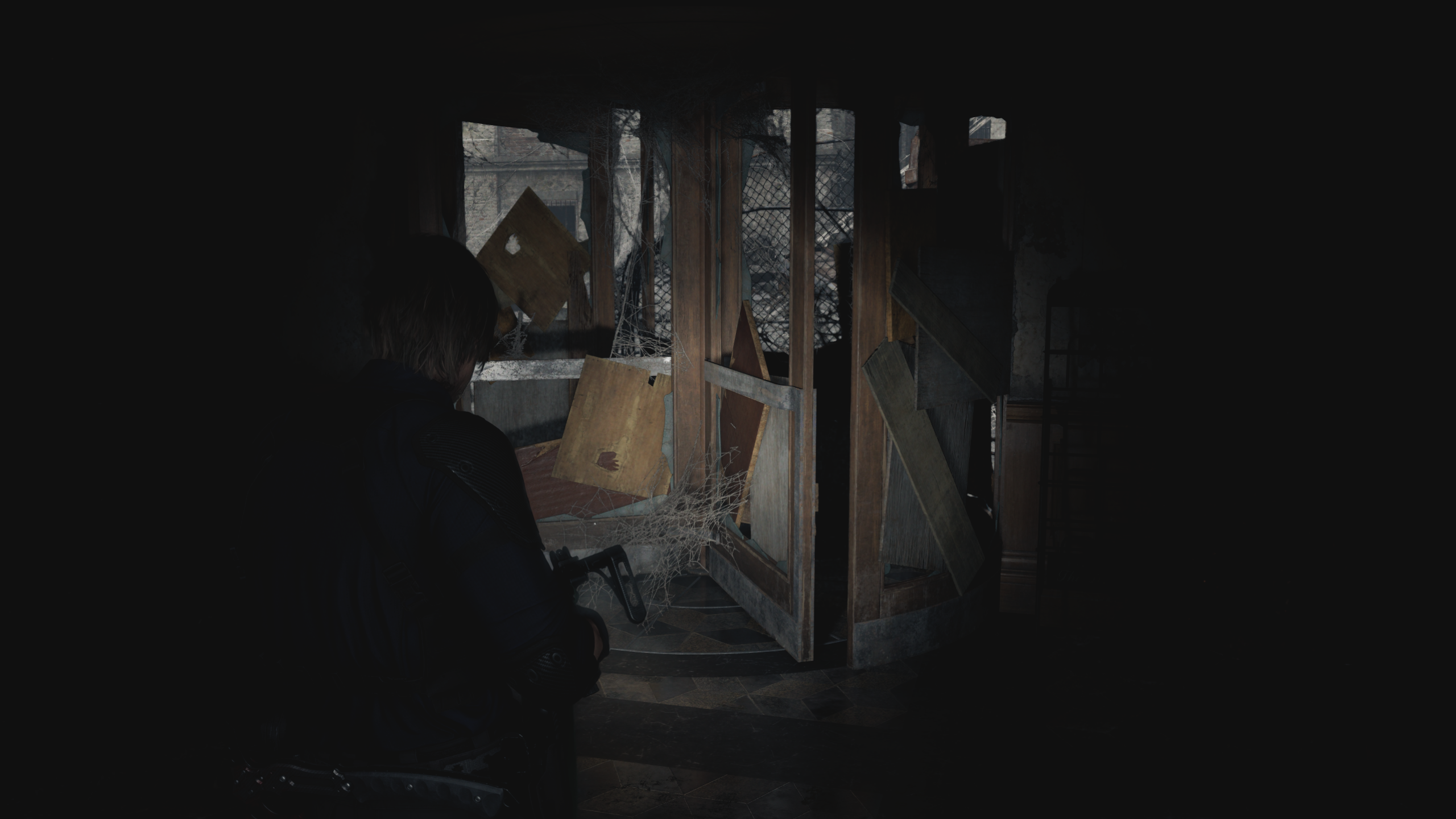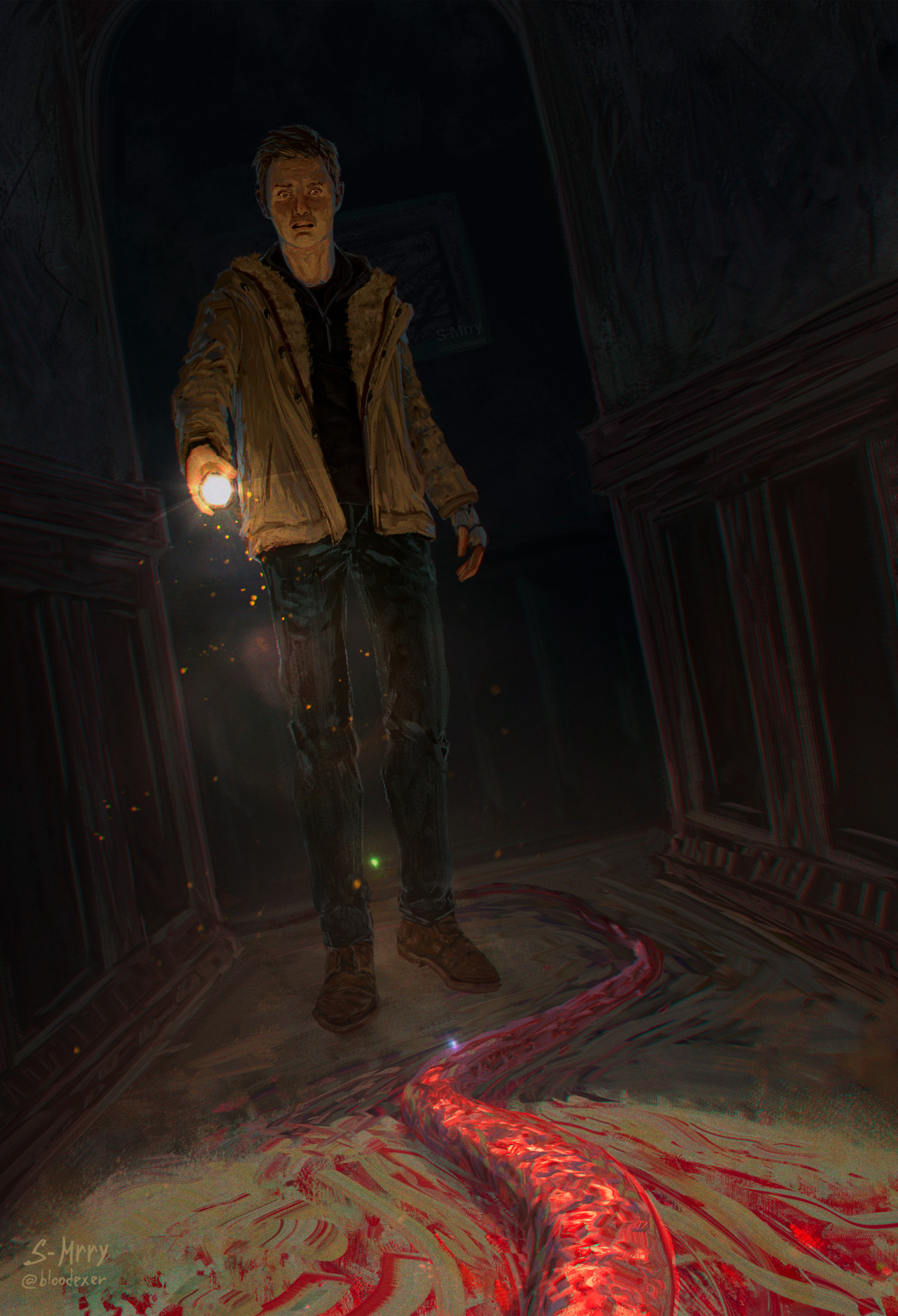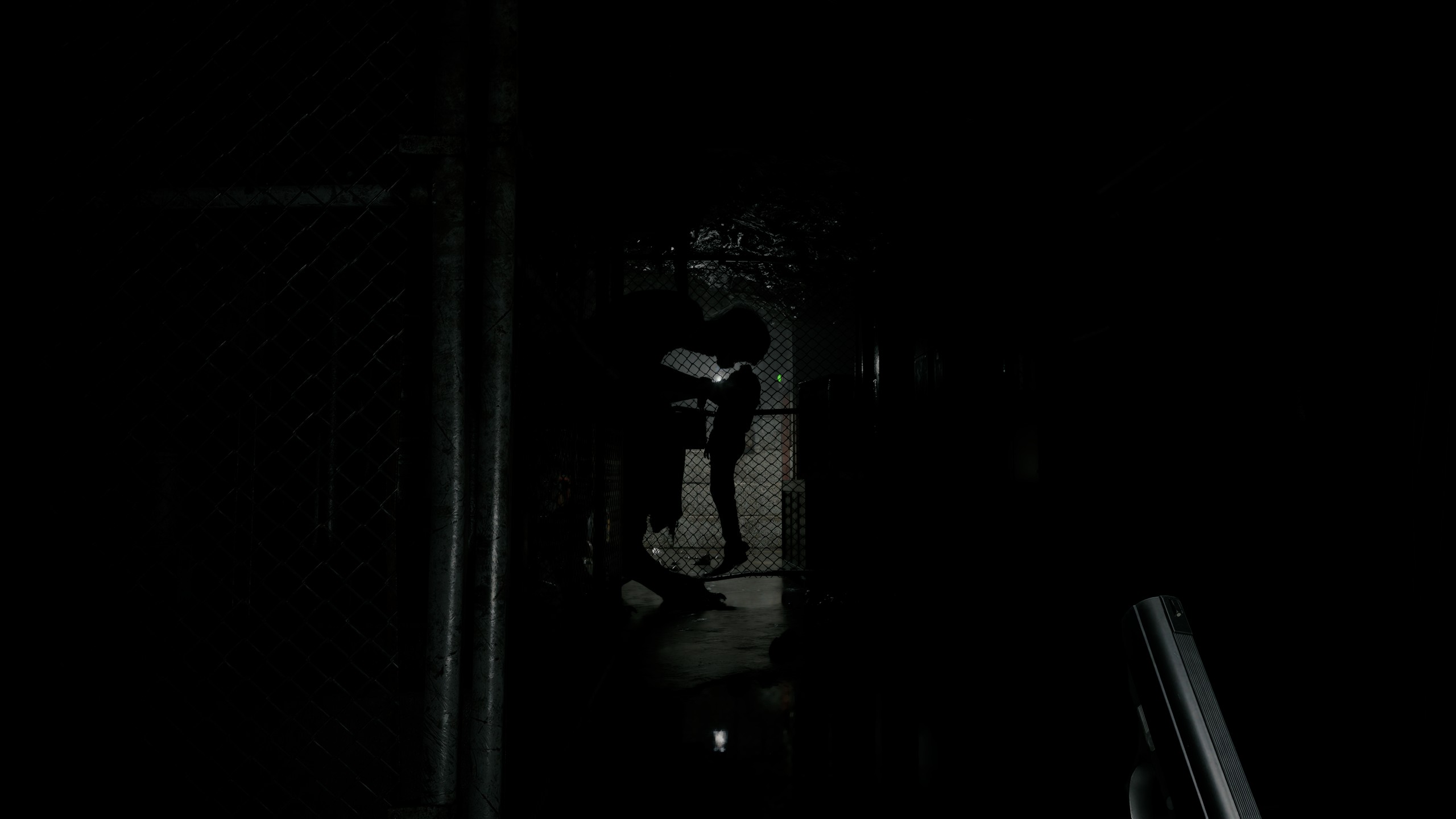 Неубиваемая хуйня преследует по темноте, хуйня на ГГ застряла между стеной и открытой дверь. Хуйня нейм ловит.