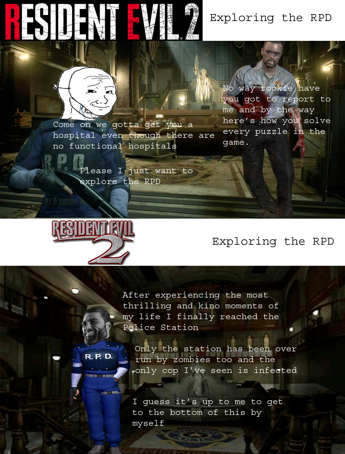 >>50620694 Да не очкуй. За Клэр точно такой же сценарий, его ваще не играй, хуйня без задач. За Леончика сразу без раздумий. У тебя больше проблема не с игрой, а скорее с тем что тебе очково. И не старайся убивать каждого зомби, где-то лучше убежать или проигнорировать, бэктрэкича много в полицейском участке, поэтому старайся запомнить как устроена локация, она достаточно логично выстроена.