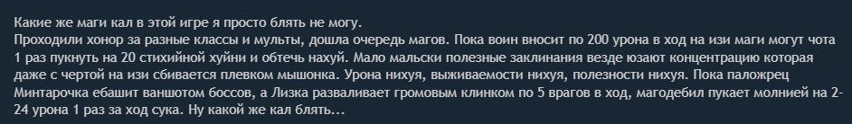 >Вон, даже заядлые задроты в бочки говорят что ноль в игре вариативности и всё выруливают милишники с автоатакой Сообщение в посте >маги могут чето 1 раз пукнуть и обтечь Сообщение в скриншоте поста >Это потому что в бг3 баланс оригинального днд5 успешно просрали, позволив обвешиваться артефактами во все слоты, плюс добавив кучу васянской имбовой хуйни. И твое сообщение объясняющее почему правы два верхних сообщения про слабость магов.