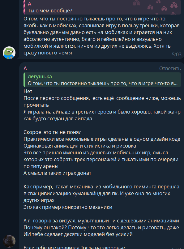 И ведь в камментах реально какая-то тётка допустим расписывает насколько ей противна игра и тут же моментально подскакивает боевой карлик обзывая её трёшкошизом и т.д. по списку, на что она местами разумно возражает пикрил.