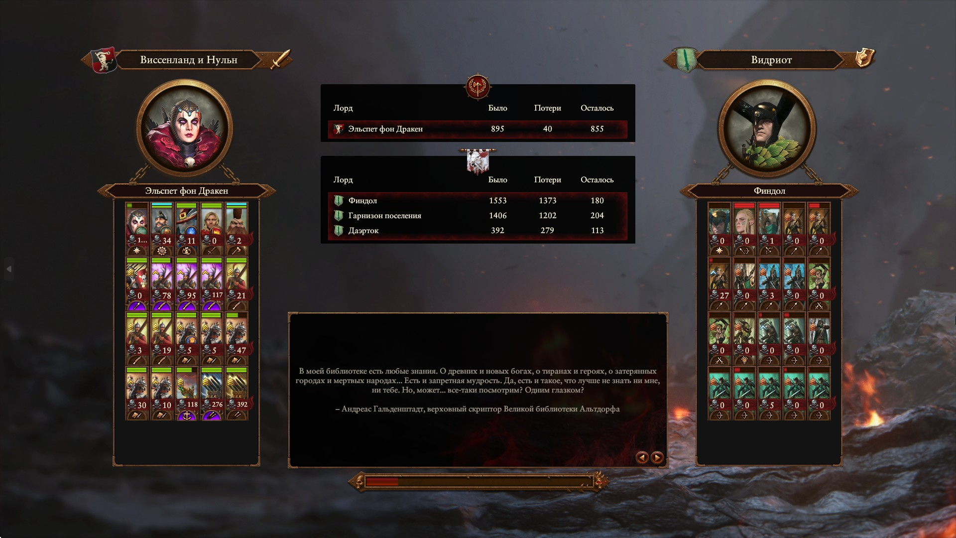 ФБ как-то совсем недоиспользует вампиров. Что в лоре, что в играх. Вампиры йоба, и маги и воены бессмертные, на каждого убитого скавена плюс крысоскелет у графств, можно всяких учёных похищать, делать их бессмертными слугами и пусть они свою нульнскую академию открывают в болотах. Наследники Нагаша, а Нагаш хаос попускает одним своим присутствием. А на деле пук-сряк посидели в Сильвании и умерли.