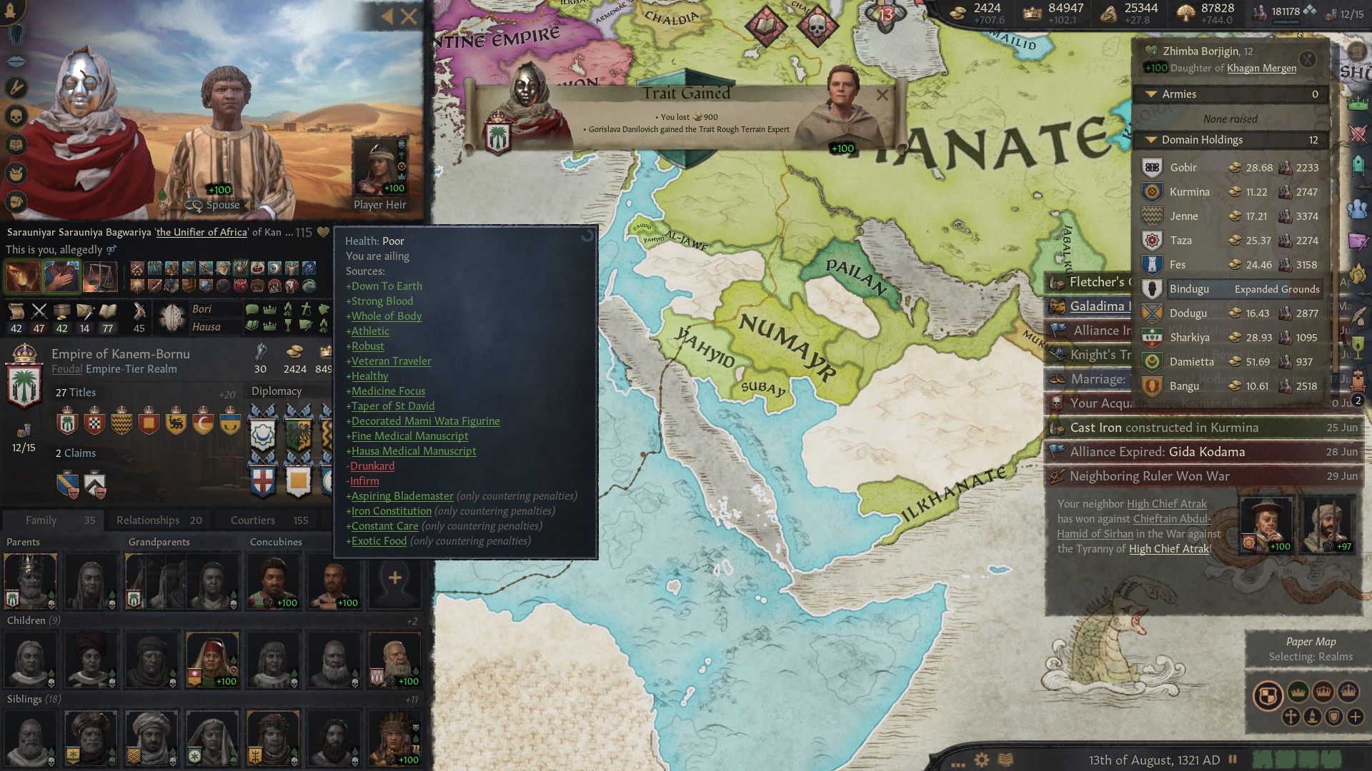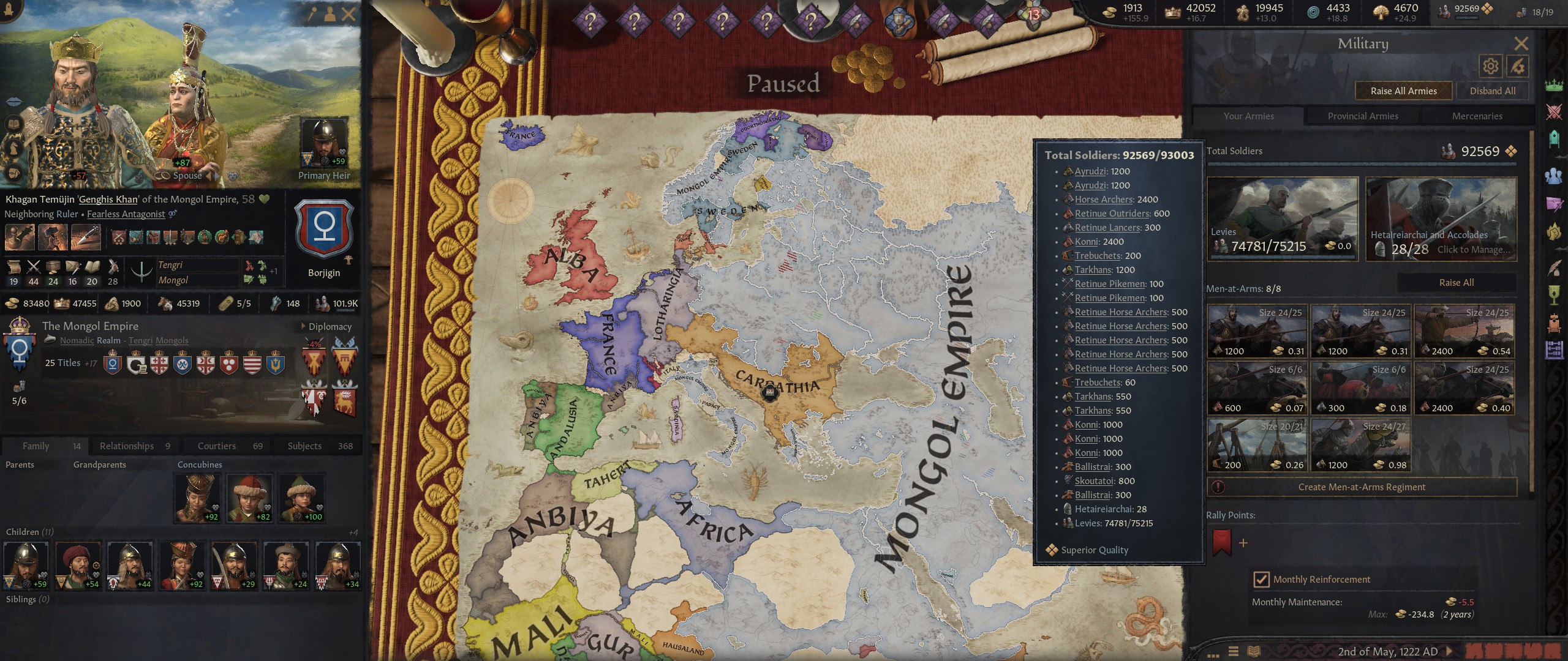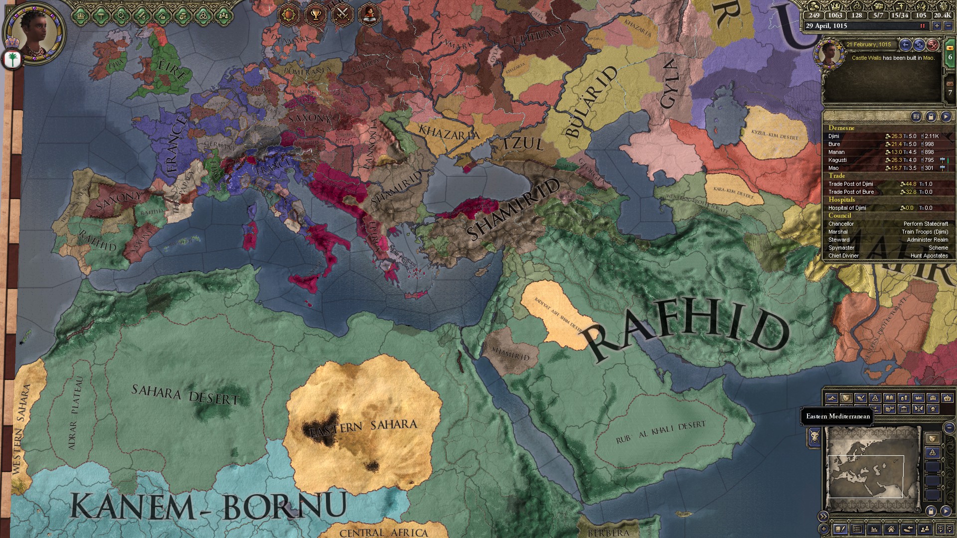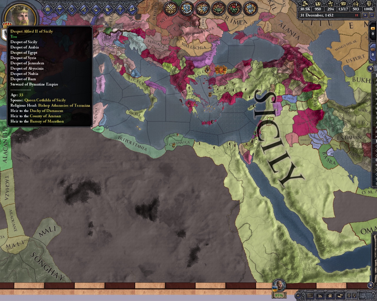 Возродил улус Джучи за 50 лет игры. Москва разорена как во времена Едигея, в этом помог союз с Польшей и Литвой, которые взяли на себя основной удар, а мои тумены методично брали крепости. На юге медленно набирают силу османы, но есть надежда стравить их с мамлюками. На востоке серьёзных соперников нет, я их превосхожу по техам и количеству.