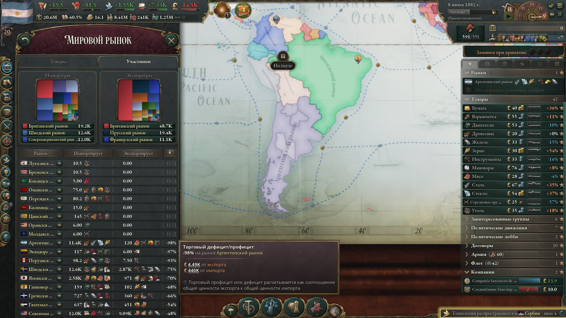 Меня скорее интересуют махинации с рынком, поскольку, как ты мог заметить, на скриншоте у меня огромный минус, но это из-за того, что я въебал максимальные субвенции на все роскошные товары, из-за чего фактически узурпировал мировую торговлю. Бедные американцы тоже пытались въебать субвенции на автомобили, но слились через некоторое время и их производство развалилось. Без субвенций ввп падает на несколько сотен миллионов, как минимум.