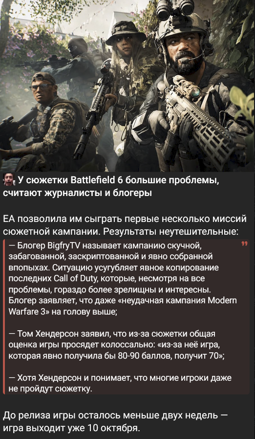 28 дней до выхода лучшей игры серии. Надеюсь что с Battlefield 6 смогу снова вкатиться в серию. Зампелла у руля разработки, он понимает что нужно кор-аудитории от Battlefield. Выкатился из серии после прохождения Battlefield 2042.